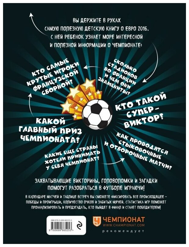 Вы держите в руках самую полезную детскую книгу о Евро 2016. С ней ребенок узнает море интересной и полезной информации о чемпионате. Кто самые крутые игроки французской сборной? Сколько стадионов во Франции и чем они знамениты? Какой главный приз чемпионата? Как проводятся стыковочные и отборочные матчи? Какие еще страны хотели принимать у себя чемпионат? Кто такой Супер-Виктор? Захватывающие викторины, головоломки и загадки помогут разобраться в футболе, играючи! В календаре матчей и таблице встреч вы сможете фиксировать все происходящее - победы и проигрыши, количество очков и забитых мячей. Статистика игр поможет проанализировать и предугадать, кто выйдет в финал и станет победителем!