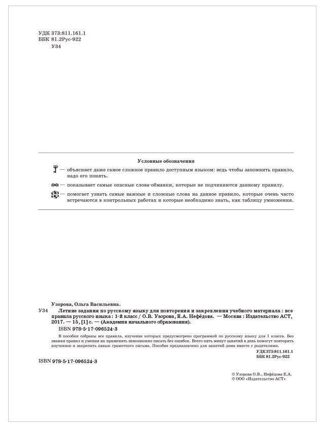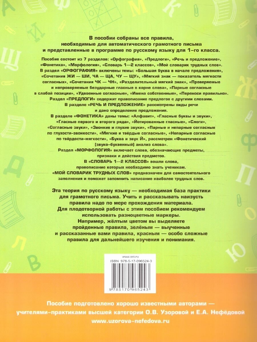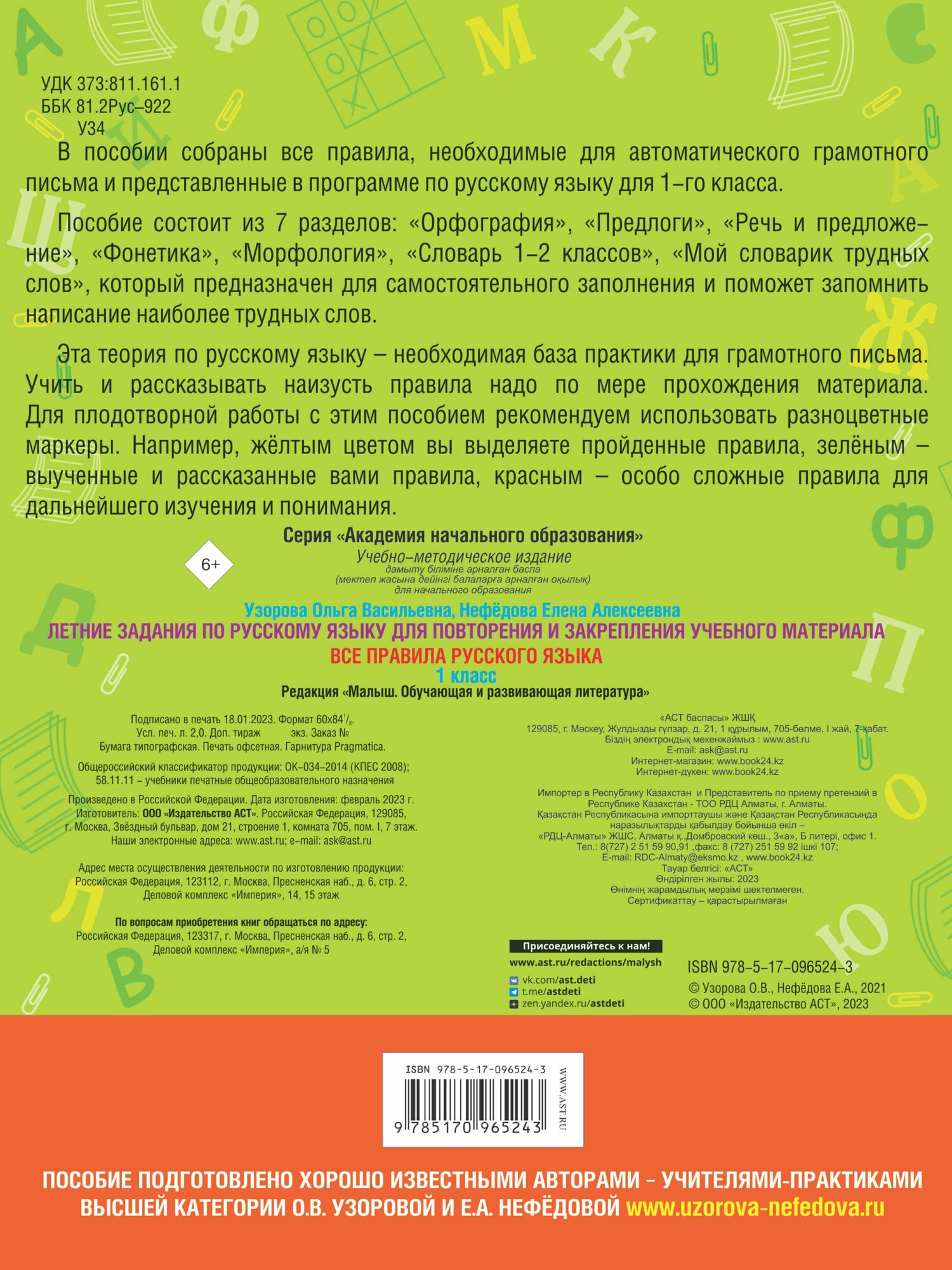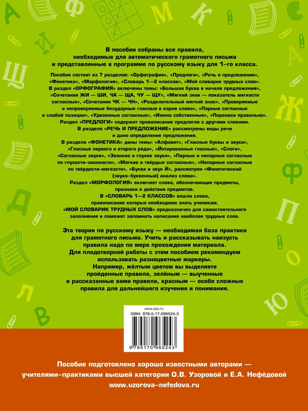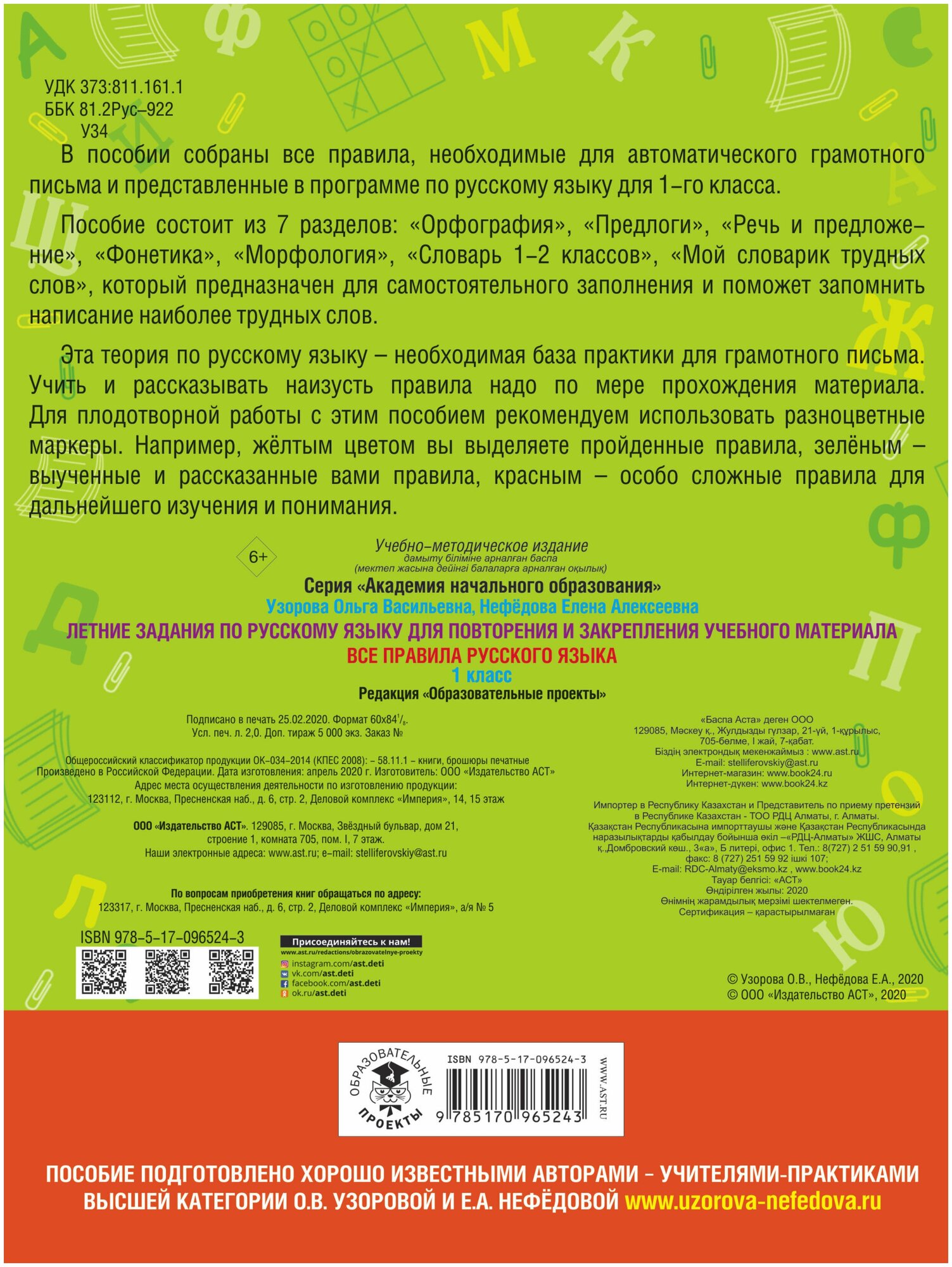 Летние занятия по русскому языку для повторения и закрепления учебного материала. 1 класс. Все правила русского языка (Елена Алексеевна Нефедова, Ольга Васильевна Узорова); АСТ, 2023