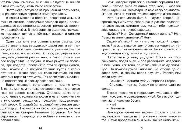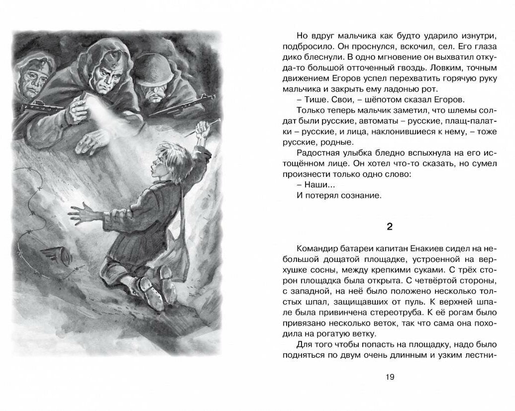 Читала это произведение со своим младшим братом. Настоящая книга для подрастающего поколения о войне. В ней все: и судьба детей, народа, и точные описания техники, баталий, работы разведчиков и артиллеристов. Очень интересно для мальчиков, интересующихся такими вещами. Отдельно необходимо отметить и качество издания - крупный шрифт, легко читается ребенком, оптимальное количество картинок. Рекомендую для чтения детишкам.