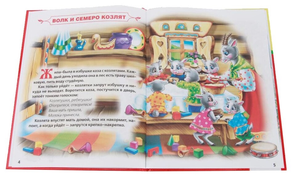 Замечательная книга! В ней 6 добрых сказок, известных нам с детства: "Волк и семеро козлят", "Маша и медведь", "Гуси-лебеди", "Заюшкина избушка", "Бычок-смоляной бочок", Лиса Патрикеевна". Книга красочная, рисунков очень много, они яркие, сочные, понятные малышам. Это сразу привлекает внимание маленьких читателей. Ребенок обожает рассматривать иллюстрации, на них изображено много мелких деталей, а это позволяет развивать внимательность. Сейчас это одна из любимых наших книг. Удобный размер книги позволяет легко поместиться в детских ручках. Еще одним плюсам является твердая обложка, что при ежедневном использовании просто необходимо и существенно продлевает жизнь книге. Страницы тонкие, но плотные.