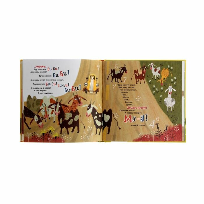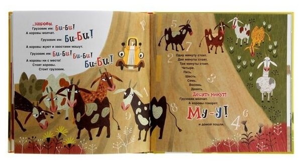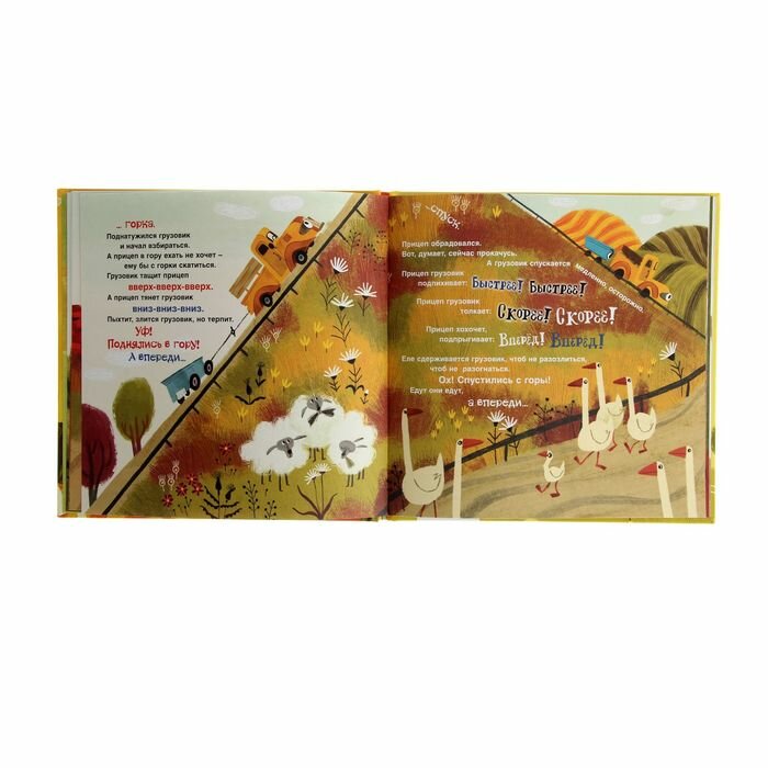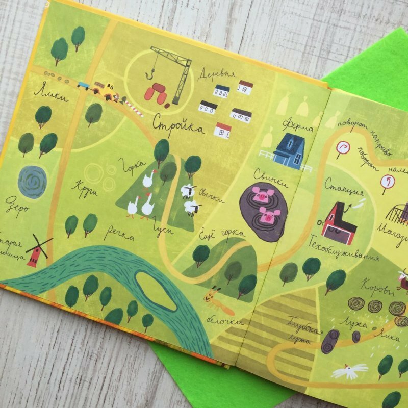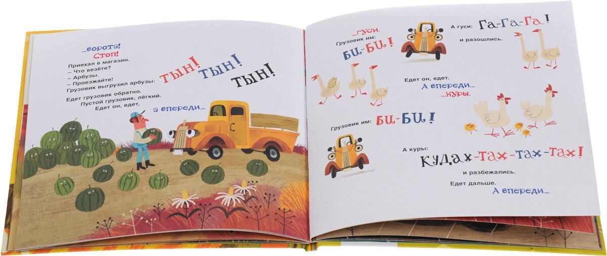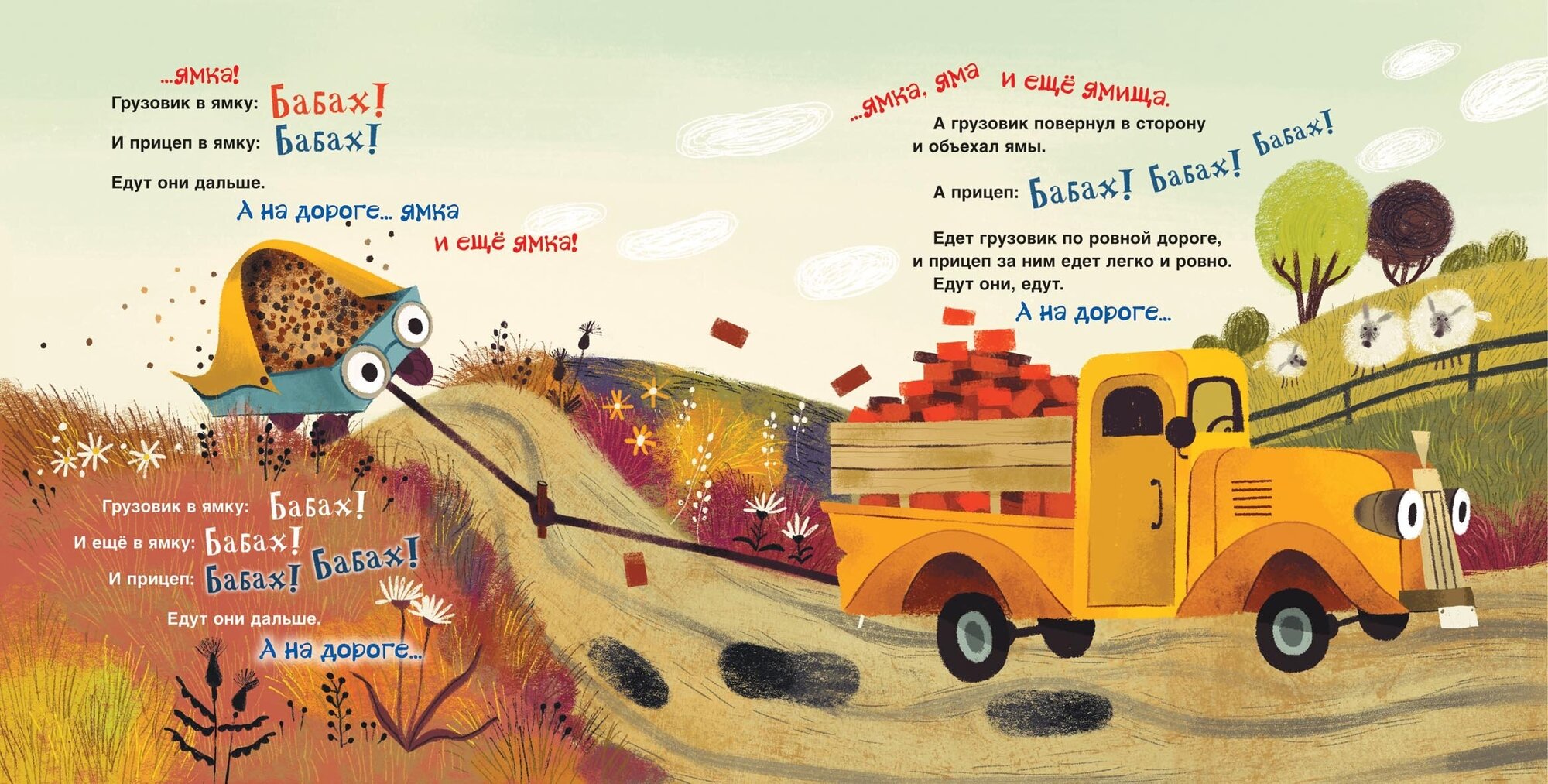 Книга необычная - в ней много повторов, звукоподражаний, строчки пляшут, скачут, огибают картинки - в общем, читать эту историю монотонным голосом, просто перелистывая странички, не получится. Придется и порычать, и потопать, и помычать, а лучше взять в руки игрушку-машинку, и показывать, как она то с горки Вжух! То в ямку - бабах! При этом здесь не просто игра ради игры. Можно попутно повторить массу понятий, противоположности, например: вверх-вниз, влево-вправо, тяжелый-легкий, пустой-полный, быстрый-медленный, темно-светло, сухо-мокро... а еще голоса животных, и счет до десяти, и даже наглядное объяснение инерции. И все это - не просто набор фраз и картинок, есть динамичный сюжет, где придется сначала попереживать, а затем успокоиться и порадоваться. Потому что сама история - о дружбе (а еще, говорят, о родителях и детях), а все игры слов, звукоподражания и веселые картинки обыгрывают этот сюжет. История довольно длинная получается, хотя на каждой странице текста не много. Но ребенку в 1,2 нравится не только слушать, но и пальчиком показывать персонажей, рассматривать все внимательно. Иллюстрации такие, знаю, не всем нравятся, но здесь очень органично смотрятся. На форзаце есть карта, по которой можно проследить маршрут героев и поиграть-покатать маленькие машинки.