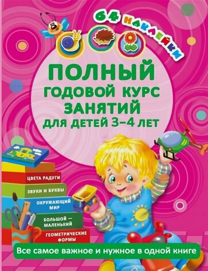 «Полный годовой курс» — развивающее пособие для обучения малышей в возрасте 3–4 лет, созданное по авторской методике А.С. Матвеевой. Выполняя увлекательные задания, ребенок значительно расширит кругозор и разовьет интеллект, выучит буквы, научится правильно произносить звуки, познакомится с понятиями формы, цвета, размера и количества предметов, научится считать до 10, рассказывать, объяснять, читать стихи наизусть. 64 наклейки превратят обучающие занятия в увлекательную игру. Для дошкольного возраста.