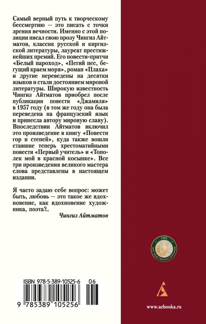 Самый верный путь к творческому бессмертию - это писать с точки зрения вечности. Именно с этой позиции пишет свою прозу Чингиз Айтматов, классик русской и киргизской литературы, лауреат престижнейших премий. Его повести-притчи "Белый пароход", "Пегий пес, бегущий краем моря книги", роман "Плаха" и другие переведены на десятки языков и стали достоянием мировой литературы. Широкую известность Чингиз Айтматов приобрел после публикации повести "Джамиля" в 1957 году (в том же году она была переведена на французский язык и принесла автору мировую славу). Впоследствии Айтматов включил это произведение в книгу "Повести гор и степей", куда также вошли ставшие теперь хрестоматийными повести "Первый учитель" и "Тополек мой в красной косынке". Все три произведения великого мастера слова представлены в настоящем издании.