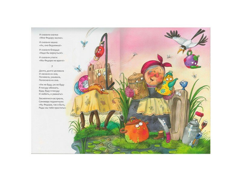 Книжка просто прелесть. Хоть и в мягком переплете, но обложка очень плотная, странички тоже хорошего качества - плотные, глянцевые, а рисунки - ну просто замечательные, яркие, позитивные, даже грязная Федора у художника получилась красоткой. Думала сначала, что цена слишком завышена для одного стихотворения, но, поверьте, она того стоит. И не скупитесь, покупайте всю серию, такая красота должна быть у ребенка, я уж не говорю про замечательные стихи Чуковского