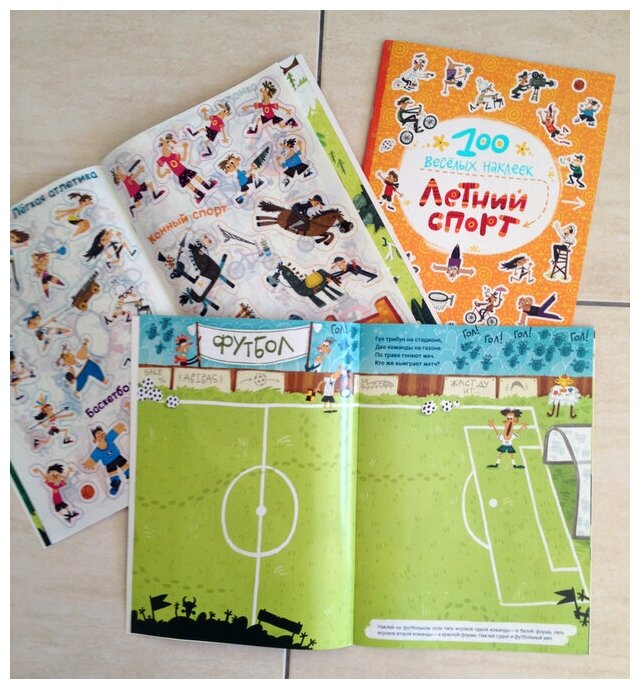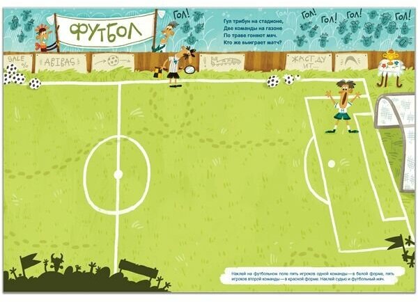 баскетбольную площадку и др., нужно расположить 100 веселых многоразовых наклеек – теннисистов, гимнастов, велосипедистов, футболистов, пловцов и многих
