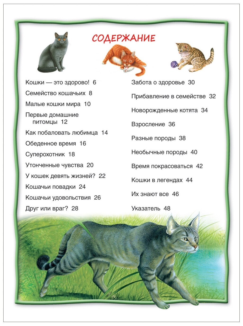 В книжке интересно и понятно рассказывается о наших любимых пушистых питомцах. Начинается с общей информации о их происхождении. Вкратце описаны наиболее известные крупные и не очень современные дикие представители кошачьих: от тигра до камышового кота. Описано строение кошки, особенности облика, привычек и повадок. Особое место отводится рождению и развитию котят. Приводятся базовые советы по уходу и обращению с кошкой. Также описано с десяток известных и распространенных пород: где и когда выведены, отличительные особенности экстерьера. В заключение рассказано о приметах и поверьях, связанных с кошками. А также упоминаются клубы любителей кошек и проводимые ими выставки. По ходу всего повествования имеются блоки с вопросами по информации на странице. А также творческие задания навроде создания авторских медалей призерам кошачьих выставок.