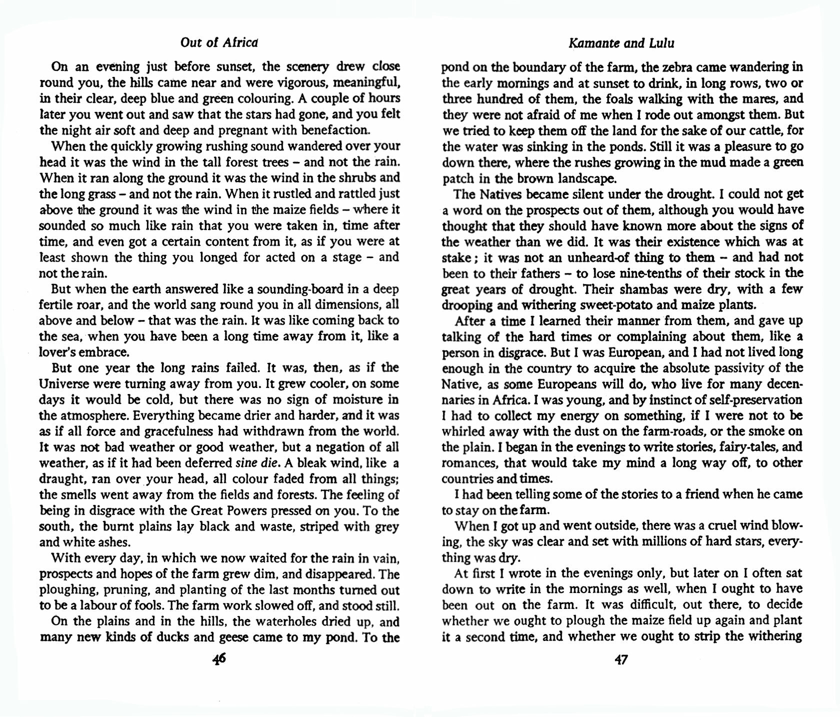 'I had a farm in Africa, at the foot of the Ngong Hills... Up in this high air you breathed easily... you woke up in the morning and thought: Here I am, where I ought to be.'