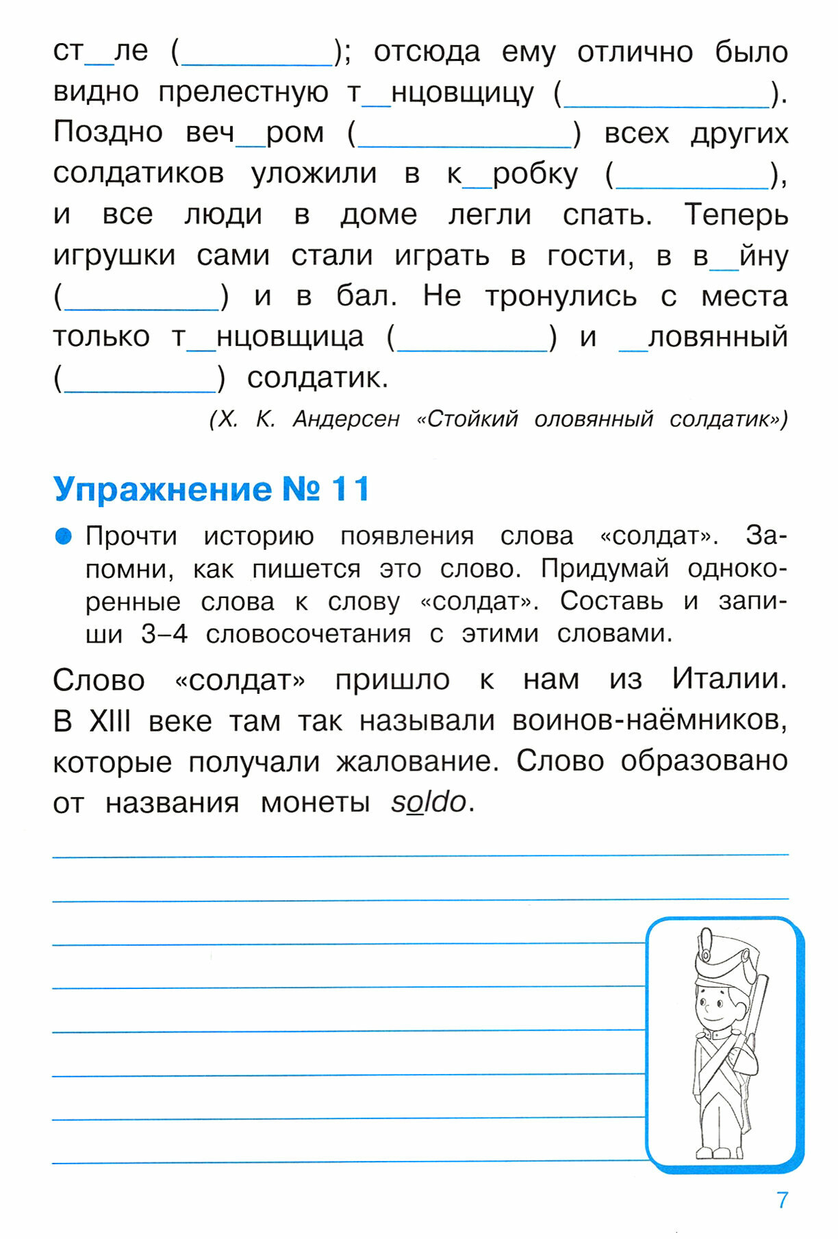 интересные задания и познавательные - карлики и великаны собрали коллекцию слов, в которых есть "кар" и "ве" - нужно дополнить эту коллекцию. Или, к примеру, написана история слова "каникулы", "солдат". Словарные слова записаны с картинками-схемами так легче запомнить их написание (горох, собака, яблоко, орех).