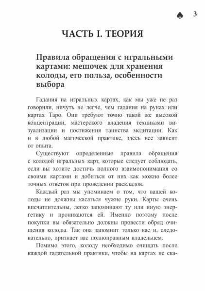 .Вторая часть - практика гадания на игральных картах: техники раскладов общих и специальных (поиск пути, ответ, решение, выбор, любовные отношения, деньги и т.п.), пасьянсы, схемы гаданий - простых и сложных, с разным количеством карт.