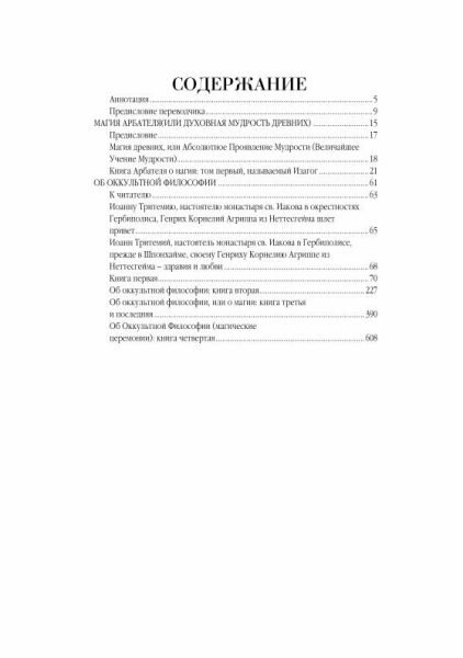 Сборник работ по магии, основу которого составляет первое полное издание на русском языке трех книг по оккультной философии Агриппы Неттесгеймского, дополненное приписываемой ему разными авторами с разным успехом четвертой книги оккультной философии и близкой по тематике работой Магия Арбателя, которая и заявлена в названии книги.