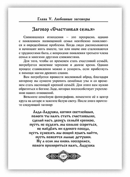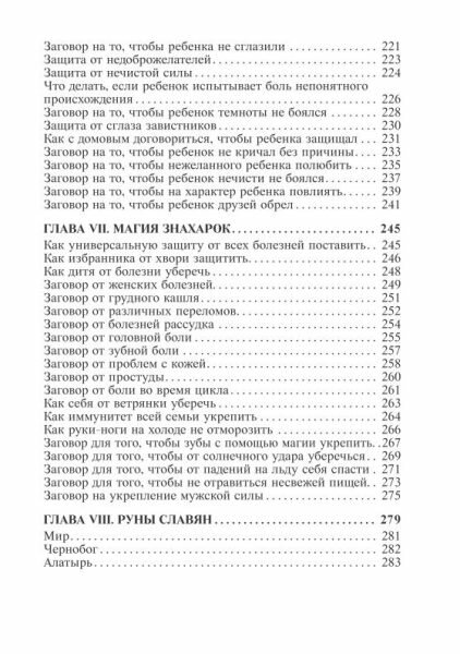 Основа славянской магии - это заговорная традиция, однако без сопровождающего ритуала многие заговоры не имеют силы. Достоинство этой книги в том, что к заговорам здесь не только добавлено описание ритуальных действий, но и объясняется смысл и контекст заговора и сопроводительного ритуала. Итак, в книге представлены такие группы заговоров и ритуалов, как денежные, кладбищенские, защитные, любовные, целительные, облегчающие роды, порчи и проклятия. Отдельно стоит упомянуть о разделах, посвященных славянским рунам, при всей спорности данного предмета и о славянских амулетах. Рекомендуется лицам с устойчивой психикой и твердыми намерениями.