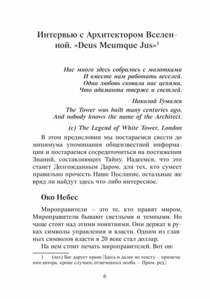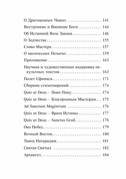 Отзывов на такие книги всегда мало, но читателю хочется понимать, с чем он имеет дело. Это одна из самых лучших и значительных книг, можно сказать, пособий, по продвижению человека на пути силы, черной магии. Здесь много читатель найдет о символике и много новых ценных знаний об Архитекторе вселенной, узнает о новом мироустройстве и своем месте в этой системе. Для мага-практика бесценно и информативно. Книга не содержит бесконечное количество практических методик, но заставляет думать и понимать самое важное, это даже значительнее ритуалов. Из необычного - внутри вы найдете довольно много стихов автора на тему издания, сначала я их пропустила за вроде как ненадобностью, но потом поняла, что они тоже часть потока информации. В общем, каждый найдет здесь самое ценное для себя. Если цель учиться и идти вперед по выбранной системе, то эта книга однозначно рекомендована.