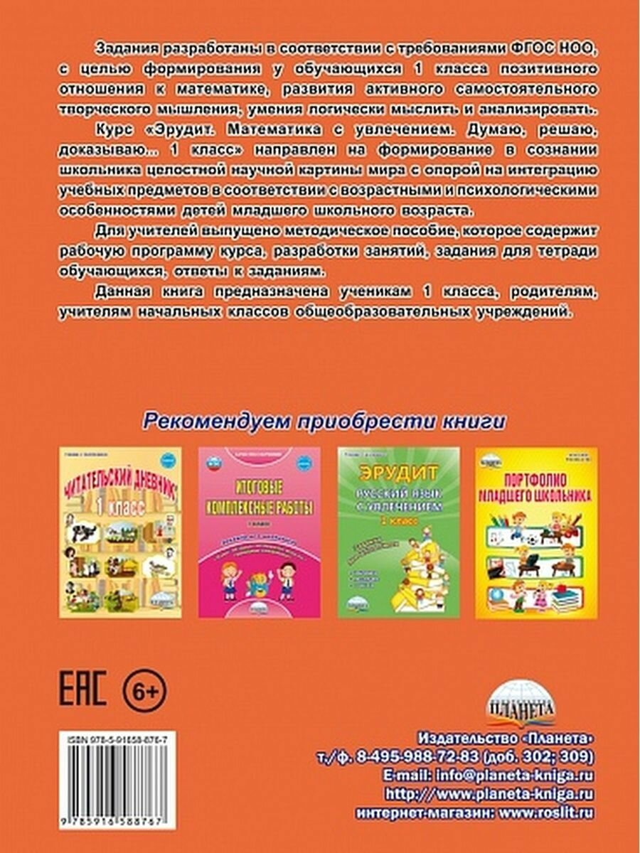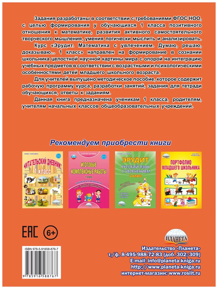 .Курс "Эрудит. Математика с увлечением. Думаю, решаю, доказываю... 1 класс" направлен на формирование в сознании школьника целостной научной картины мира с опорой на интеграцию учебных предметов в соответствии с возрастными и психологическими особенностями детей младшего школьного возраста.
