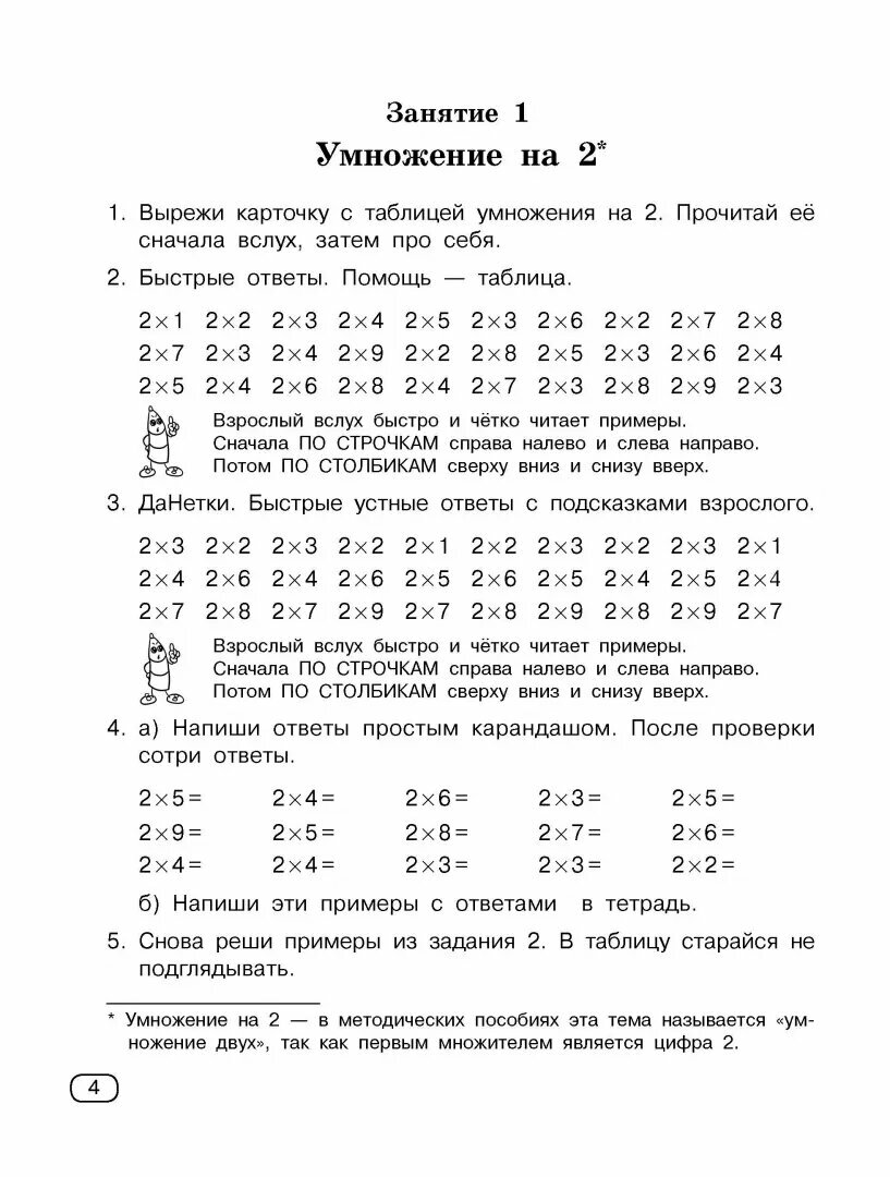 И еще, примеры из книжки лучше сразу выписывать в тетрадку и уже там решать. Бумага в книге плохо переносит ластик, писать ответы карандашиком и стирать получается 2-3 раза. Далеко не всем деткам этих двух-трех раз достаточно. Удачи в освоении умножения!