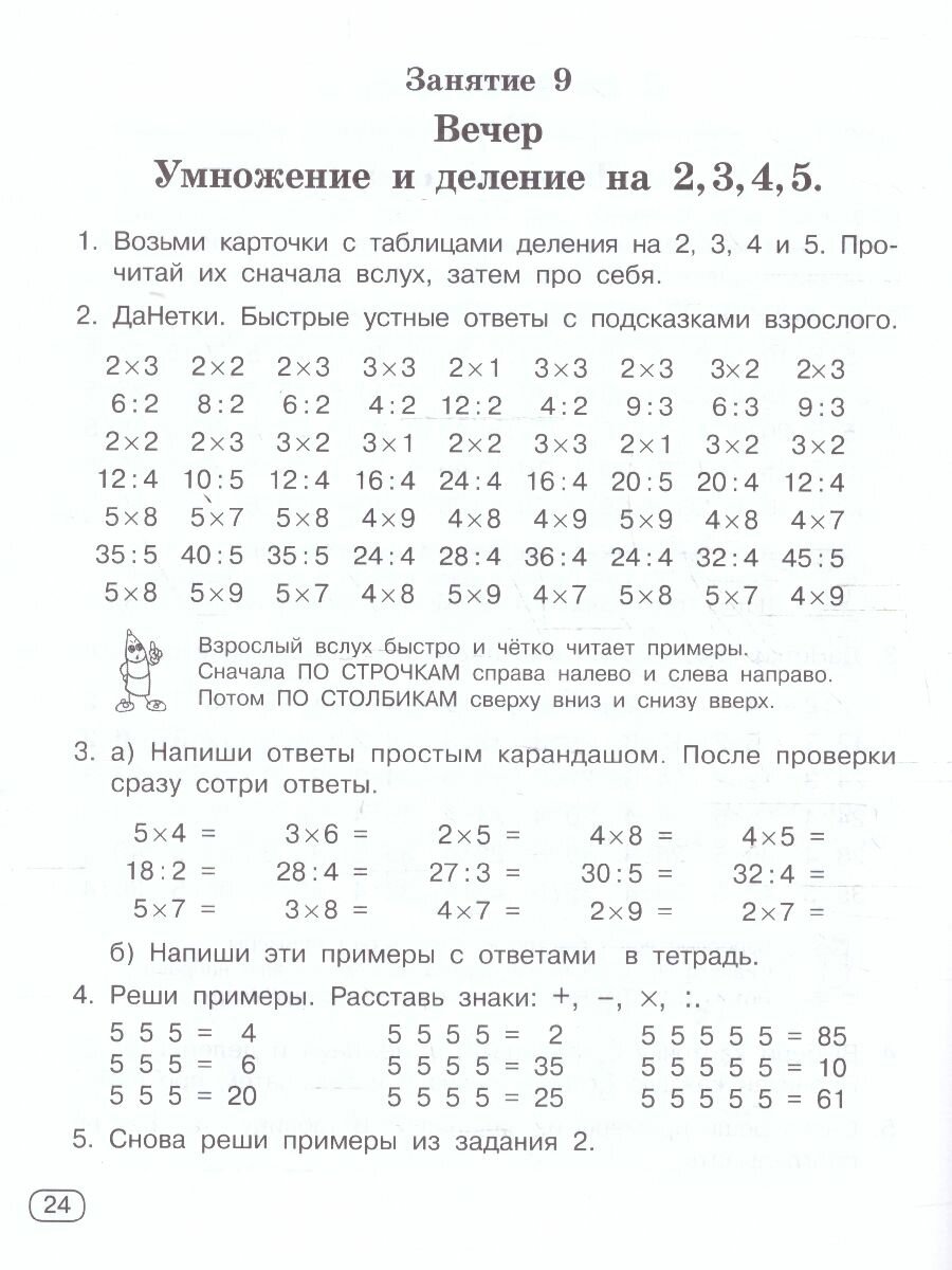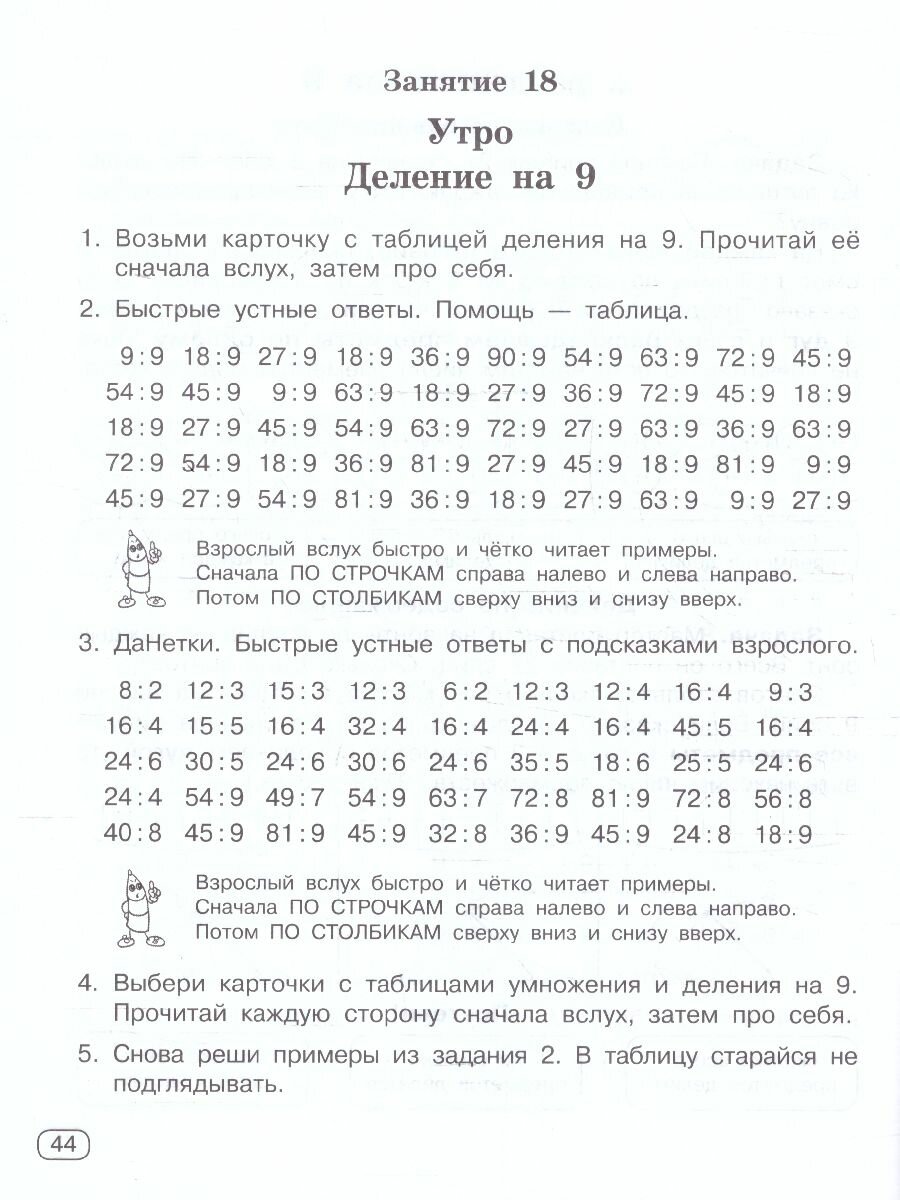 Очень хорошее толковое пособие. Рискну дать пару советов родителям. Если вы планируете это пособие использовать параллельно с изучением умножения-деления в школе, то работайте подряд по всем темам-страничкам. Если же вы собираетесь, как это сейчас принято, заранее на каникулах начать учить таблицу умножения, пользуйтесь только заданиями со страничек с умножением не рассматривая деление. К делению вернетесь уже в учебном году.