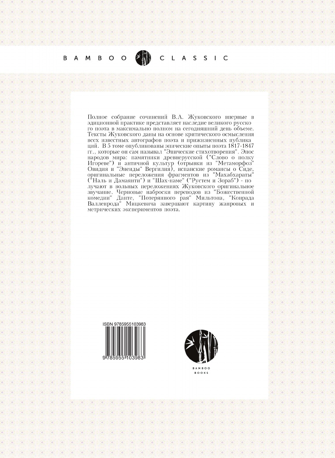 Полное собрание сочинений в двадцати томах В.А.Жуковского впервые в эдиционной практике представляет наследие великого русского поэта в максимально полном на сегодняшний день объеме. Тексты Жуковского даны на основе критического осмысления всех известных автографов поэта и прижизненных публикаций. В 5 томе опубликованы эпические опыты поэта 1817-1847 гг., которые он сам называл "Эпические стихотворения". Эпос народов мира: памятники древнерусской ("Слово о полку Игореве") и античной культур (отрывки из "Метаморфоз" Овидия и "Энеиды" Вергилия), испанские романсы о Сиде, оригинальные переложения фрагментов из "Махабхараты" ("Наль и Дамаянти") и "Шах-наме" ("Рустем и Зораб") - получают в вольных переложениях Жуковского оригинальное звучание. Черновые наброски переводов из "Божественной комедии" Данте, "Потерянного рая" Мильтона, "Конрада Валленрода" Мицкевича завершают картину жанровых и метрических экспериментов поэта.