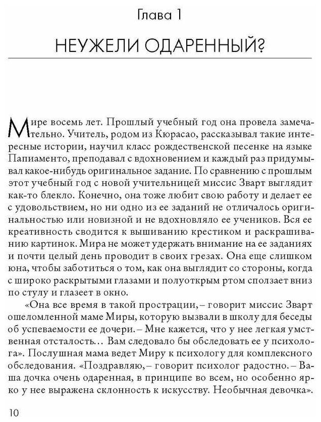 Что могу сказать по поводу этой книги. Она написана очень просто и понятно, но при этом о важном. Очень познавательно. Открывает нам завесу в жизнь детей, которые могут отличаться от других и иметь какие особые способности в разных сферах (спорт, поэзия, музыка и тд). И эта книга позволяет нам понять как с ними работать и открывать им мир с новых и более интересных для них сторон. Помогает задуматься об этом и разобрать. Но при этом одарённым может быть любой ребёнок, только нужно уметь найти способ выявить и проработать это в ребёнке. А это в дальнейшем поможет ребёнку в будущем!