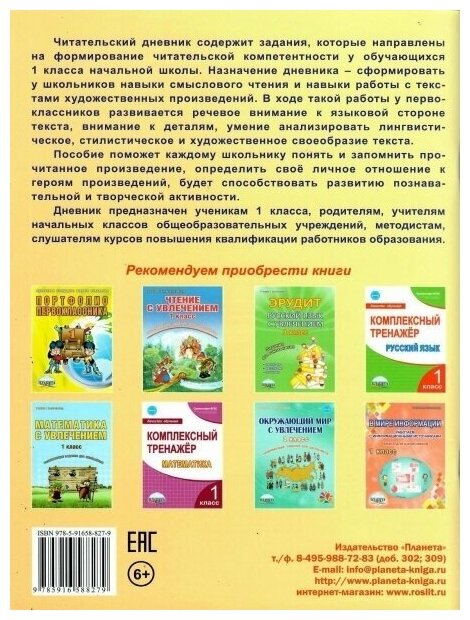 Для УМК: «Школа России», «Школа 2100», «Планета знаний», «Перспективная начальная школа», «Начальная школа XXІ века», «Гармония», «Система развивающего обучения Л. В. Занкова». Читательский дневник содержит задания, которые направлены на формирование читательской компетентности у обучающихся 1 класса начальной школы. Назначение дневника - сформировать у школьников навыки работы с текстами художественных произведений. В ходе такой работы у первоклассников развивается речевое внимание к языковой стороне текста, внимание к деталям, умение анализировать лингвистическое, стилистическое и художественное своеобразие текста. Пособие поможет каждому школьнику понять и запомнить прочитанное произведение, определить своё личное отношение к героям произведений, будет способствовать развитию познавательной и творческой активности. Дневник предназначен ученикам 1 класса, родителям, учителям начальных классов общеобразовательных учреждений, методистам, слушателям курсов повышения квалификации работников образования.