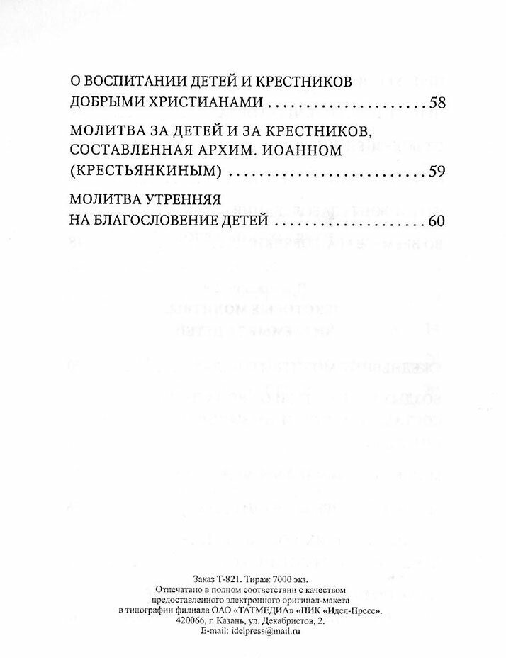 Поскольку в описании к этой книге была всего одна фраза, то взяла наугад, по интернет-заказу. Оказалось, что это не просто сборник молитв: половина книжки посвящена пояснениям священника Алексея (Грачева), за что страдают дети, как лечить с молитвой, о духовной жизни семьи и т.д. Священник до принятия сана работал детским врачом, соответственно знает, что говорит. Издание выпущено Свято-Троицким Ионинским монастырём. Книжечка карманного формата. Понравилось, что в словах молитв проставлены ударения, ведь молитвы не на привычном нам, разговорном языке - расстановка правильных ударений очень кстати.