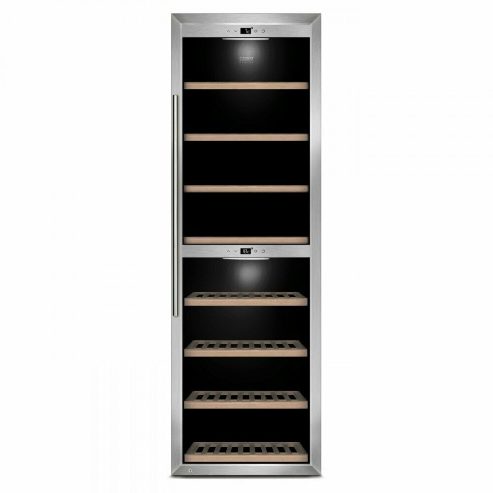 CASO - элегантный винный компрессорный холодильник на 180 бутылок, две отдельные зоны для хранения как белого так и красного вина, с раздельно регулируемыми температурными зонами с диапазоном 5-22°С.