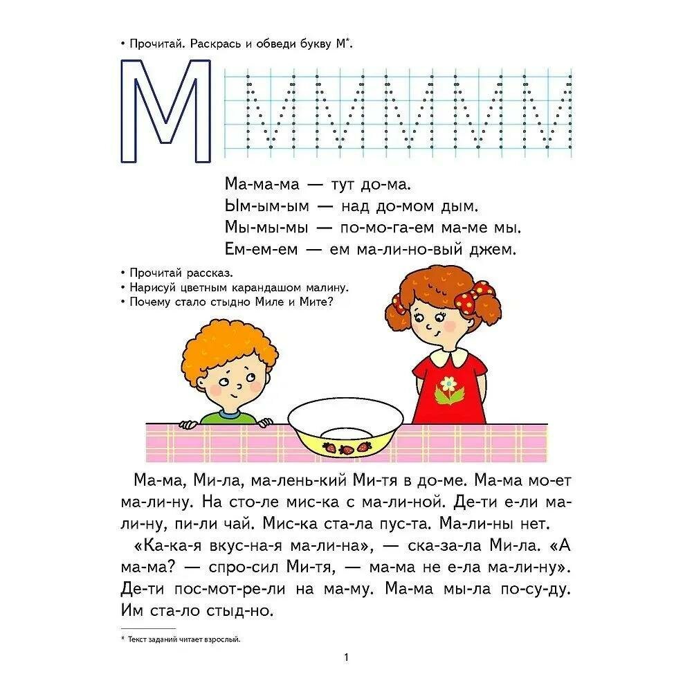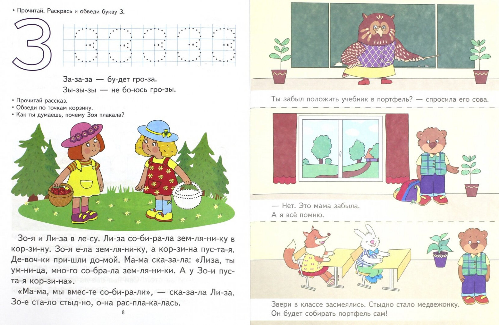 На каждый звук отведена одна страница, на которой графическое задание с буквой, чистоговорка и поучительный рассказ, а также небольшое задание и вопрос на понимание текста.