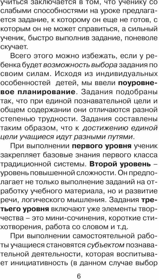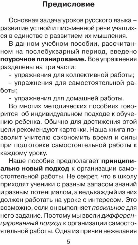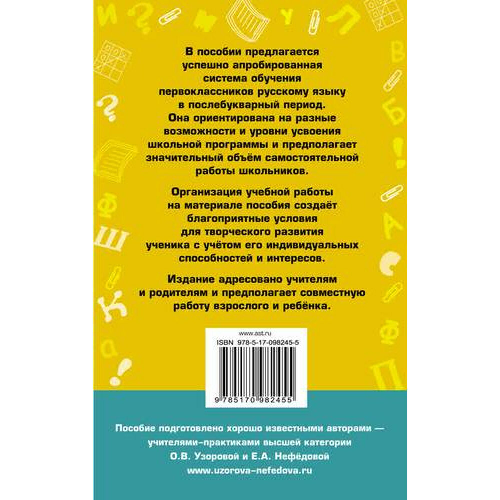 В пособии предлагается успешно апробированная система обучения первоклассников русскому языку в послебукварный период. Она ориентирована на разные возможности и уровни усвоения школьной программы и предполагает значительный объем самостоятельной работы школьника.