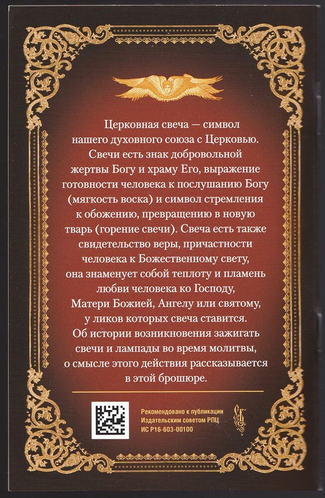 Церковная свеча — символ нашего духовного союза с Церковью. Свечи есть знак добровольной жертвы Богу и храму Его, выражение готовности человека к послушанию Богу (мягкость воска) и символ стремления к обожению, превращению в новую тварь (горение свечи). Свеча есть также свидетельство веры, причастности человека к Божественному свету, она знаменует собой теплоту и пламень любви человека ко Господу, Матери Божией, Ангелу или святому, у ликов которых свеча ставится. Об истории возникновения обычая зажигать свечи и лампады во время молитвы, о смысле этого действия рассказывается в этой брошюре.