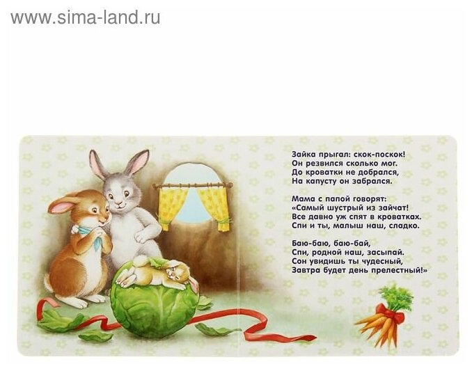 Книга маленького формата. Очень удобна для маленьких детских ручек. Страницы очень плотные, толстые. Отличные небольшие стихотворения на каждом развороте. А также милые иллюстрации любимых персонажей всех детей - зверят. Читали перед сном. Малышке 1- 1.5 года очень нравилась книга. Качество книги хорошее.