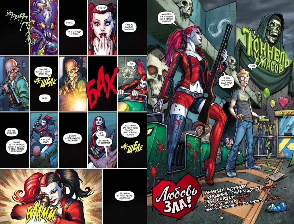 Надеюсь никто из тех кто собирается ее прочесть не думают о какой бы то ни было серьезности в данной книге. Она не о том. Этакий трешевый боевик с классной картинкой и хорошо проработанными персонажами. Вообще впервые узнаю кто такая Харли (фильм не в счёт), очень мне понравилась. Персонаж выглядит свежо, шуточки и немного прибабаха ей к ли*у) В общем рекомендую тем, кто не ждёт серьезности от данной книги. Весело провести час другой=)
