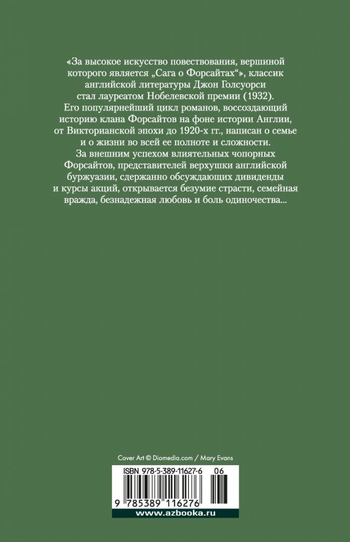 «За высокое искусство повествования, вершиной которого является "Сага о Форсайтах"», классик английской литературы Джон Голсуорси стал лауреатом Нобелевской премии (1932). Его популярнейший цикл романов, воссоздающий историю клана Форсайтов на фоне истории Англии, от викторианской эпохи до 1920-х гг., написан о семье и о жизни во всей ее полноте и сложности. За внешним успехом влиятельных чопорных Форсайтов, представителей верхушки английской буржуазии, сдержанно обсуждающих дивиденды и курсы акций, открывается безумие страсти, семейная вражда, безнадежная любовь и боль одиночества…