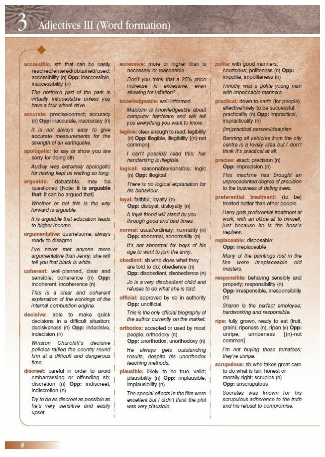 Advanced grammar and vocabulary is a vocabulary, idiom and grammar book for Advanced learners of English and is made up of write-in exercise pages alphabetically organised by language area and topic. Each exercise page is accompanied by a presentation page so that the book can be used in class or for self study.
