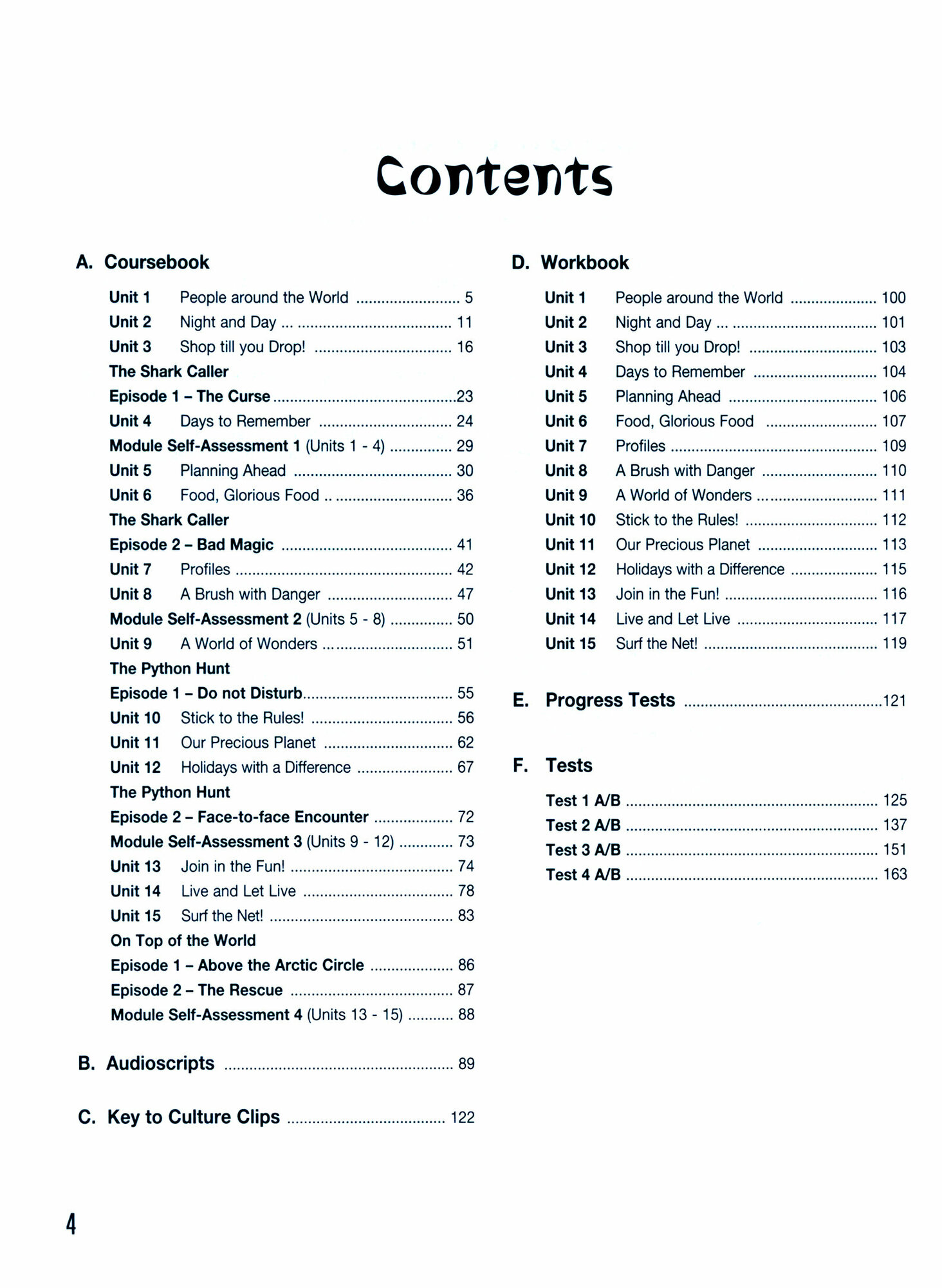 Enterprise 2 Elementary is a communicative course, specially designed to motivate and involve students in effective learning at elementary level. The course provides systematic preparation for all the skills required for successful communication both in written and spoken form. Each unit, along with its corresponding unit in the Workbook, is designed to be taught in about three to four teaching hours. The Teachers Book contains: answers to the exercises in the coursebook, supported by teaching notes and optional oral or written activities. The teaching notes provide guidance on how to deal with the material as it appears in each unit in the Students Book. The objectives of each unit are set out clearly in the Teachers Book. three tests of two versions each with answer sheets (to be used by students to fill in their answers) as well as the answers to each test and a marking scheme. The tests help teachers check vocabulary and structures presented in the course. Each test is to be given after students have done the relevant revision unit in their books. tapescripts of the recorded material. answers to the exercises in the Workbook.
