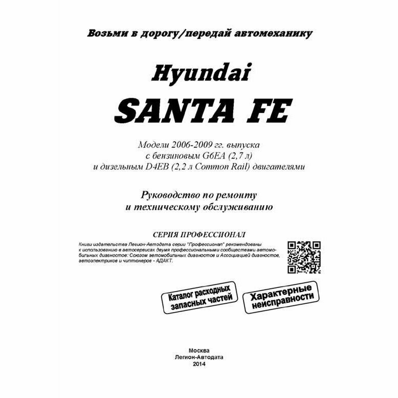 На сегодняшний день товар «Книга: Hyundai Santa Fe. Модели 2006-2009 гг. выпуска с бензиновым G6EA (27 л.) и дизельным D4EB (22 л. Common Rail) двигателями. Руководство по ремонту и техническому обслуживанию (без автора); Легион-Автодата, 2014» можно купить с кешбеком в 3 магазинах: book24, Читай-город, Буквоед