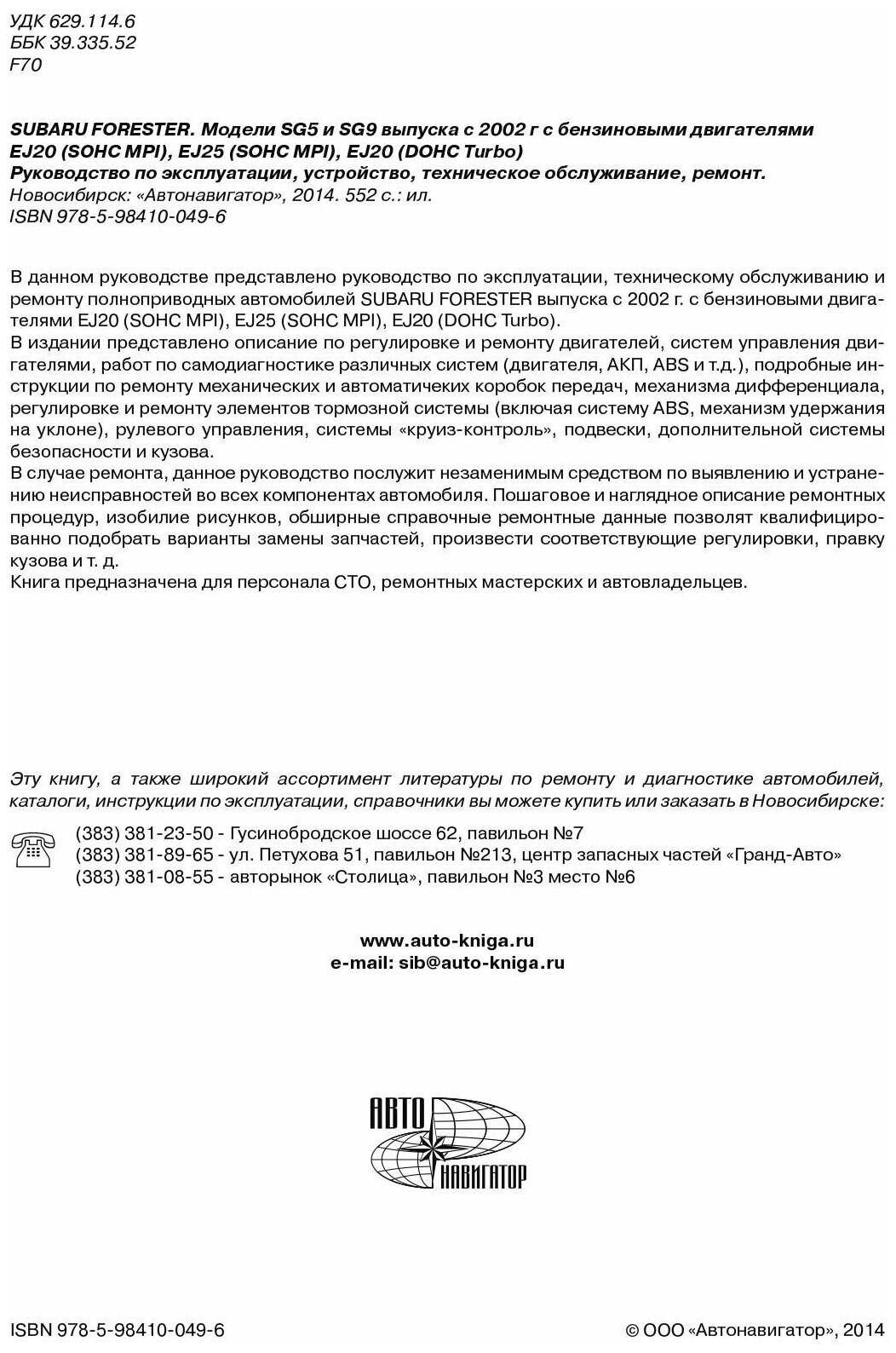 Subaru Forester. Модели SG5 и SG9 выпуска с 2002 г. с двигателями EJ20 (SOHC MPI) EJ25 (SOHC MPI) EJ20 (DOHC Turbo). Устройство техническое обслуживание и ремонт (Коллектив авторов); Автонавигатор, 2014