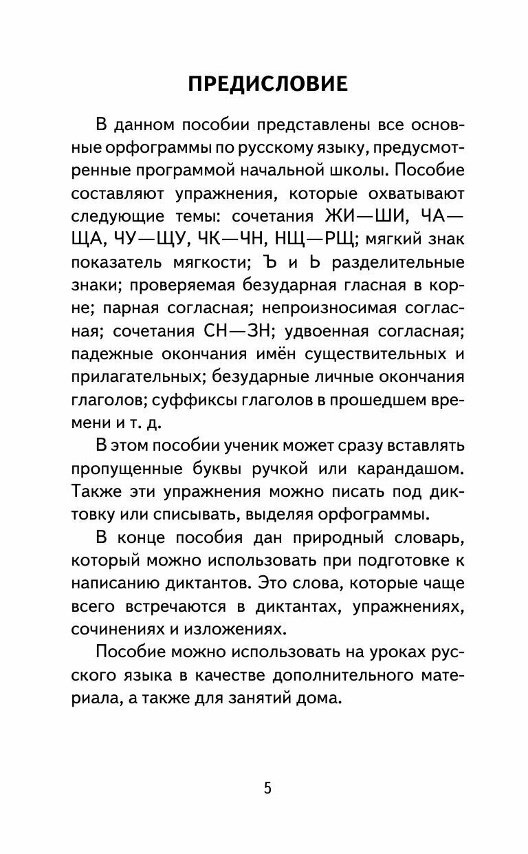 В данном пособии представлен материал для учащихся 1-5-го классов по русскому языку. Путем регулярных упражнений усвоят навыки грамотного письма и правила орфографии, которые входят в программу средней школы.