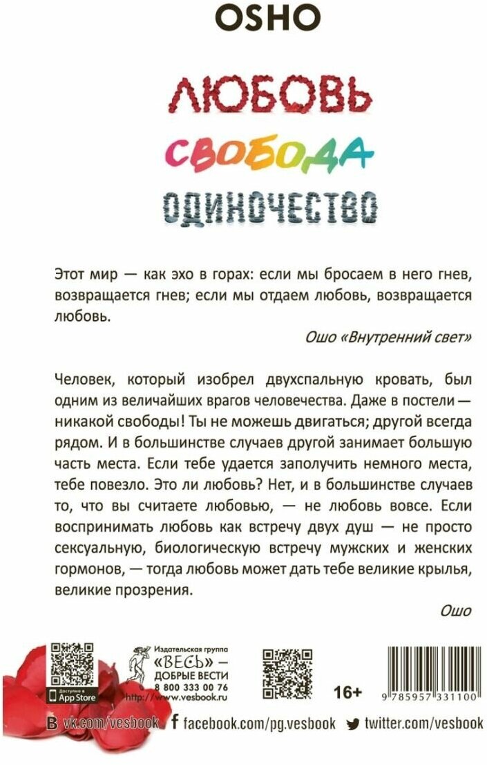 Сервис сравнения цен СкидкаГИД предлагает сравнить цены на товар «Книга: Любовь. Свобода. Одиночество. Новый взгляд на отношения (Бхагаван Шри Раджниш (Ошо)); ИГ "Весь", 2016»