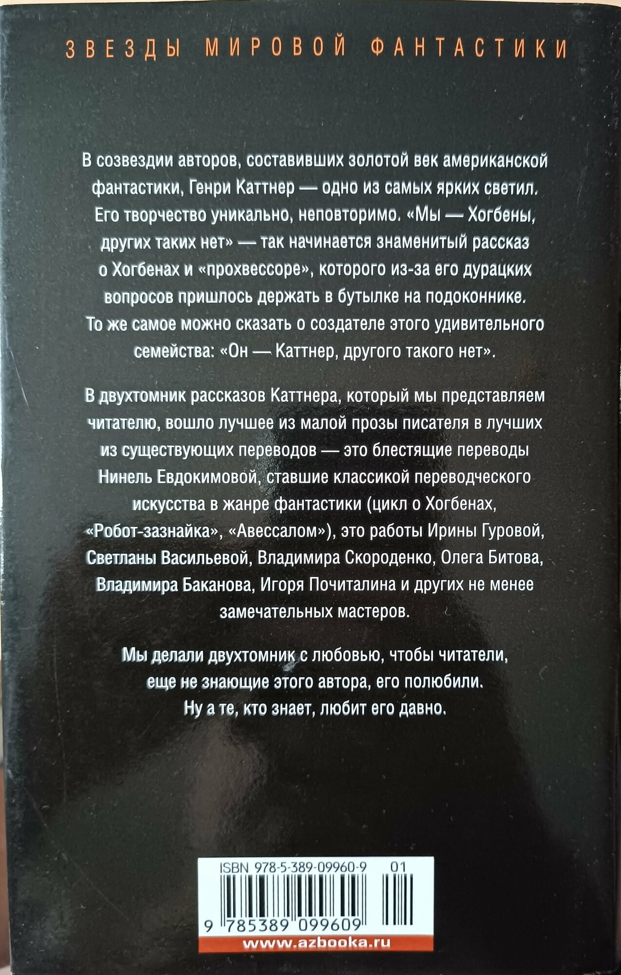 В созвездии авторов, составивших Золотой век американской фантастики, Генри Каттнер — одно из самых ярких светил. Его творчество уникально, неповторимо. «Мы — Хогбены, других таких нет», — так начинается знаменитый рассказ о Хогбенах и «прохвессоре», которого из-за его дурацких вопросов пришлось держать в бутылке на подоконнике. То же самое можно сказать о создателе этого удивительного семейства: «Он — Каттнер, другого такого нет». В двухтомник рассказов Каттнера, который мы представляем читателю, вошло лучшее из малой прозы писателя в лучших из существующих переводов — это блестящие переводы Нинель Евдокимовой, ставшие классикой переводческого искусства в жанре фантастики (цикл о Хогбенах, «Робот-зазнайка», «Авессалом»), это работы Ирины Гуровой, Светланы Васильевой, Владимира Скороденко, Олега Битова, Владимира Баканова, Игоря Почиталина и других не менее замечательных мастеров. Мы делали двухтомник с любовью, чтобы читатели, еще не знающие этого автора, его полюбили. Ну а те, кто знает, любит его давно.