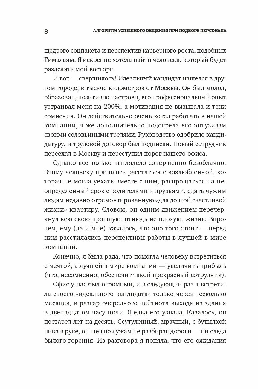 Цитата«Коммуникация, а особенно в рекрутменте, полна нюансов. Ошибки, которые мы совершаем в общении с клиентами, кандидатами, начальством и подчиненными, обычно имеют одни и те же корни. Все они растут из наших личных особенностей — или, выражаясь прямо, недостатков. Первый шаг, который нужно сделать на пути к успешной коммуникации, — честно признаться себе, что недостатки у вас есть. Это может быть очень сложно и даже болезненно, но иначе никак. Второй шаг — начать устранять эти недостатки или хотя бы взять их под контроль».Олеся ТаранЗалог успеха при подборе персонала — правильно выстроенная коммуникация на всех этапах. Автор предлагает четкий алгоритм общения при подборе сотрудников: как составить список конкретных требований к кандидату, провести собеседование, оценить профессионализм претендентов, помочь новичку на рабочем месте.• Автор разбирает основные коммуникативные ошибки, возникающие при взаимодействии рекрутеров, заказчиков и кандидатов, и предлагает конкретные шаги, как их можно предотвратить. • В книге подробно расписаны цели, которые нужно достичь при подборе нового сотрудника. Чем лучше вы будете понимать, за что отвечаете, кому и что должны, от кого и что имеете право требовать, тем меньше у вас шансов ошибиться.• Плюс книги — универсальность подхода: методика, изложенная здесь подойдет и сотрудникам кадровых агентств, и внутреннему HR, и вдумчивому нанимающему менеджеру.• В книге предложены тесты, которые помогут оценить успешность работы при подборе персонала.Для когоДля рекрутеров, консультантов по подбору персонала, нанимающих менеджеров и руководителей компаний.Об авторе Олеся Таран — эксперт по подбору персонала с пятнадцатилетним стажем и управляющий партнер в компании Aveco Career Partners. Также консультирует службы подбора персонала и разрабатывает программы по обучению как профессиональных рекрутеров, так и нанимающих менеджеров.