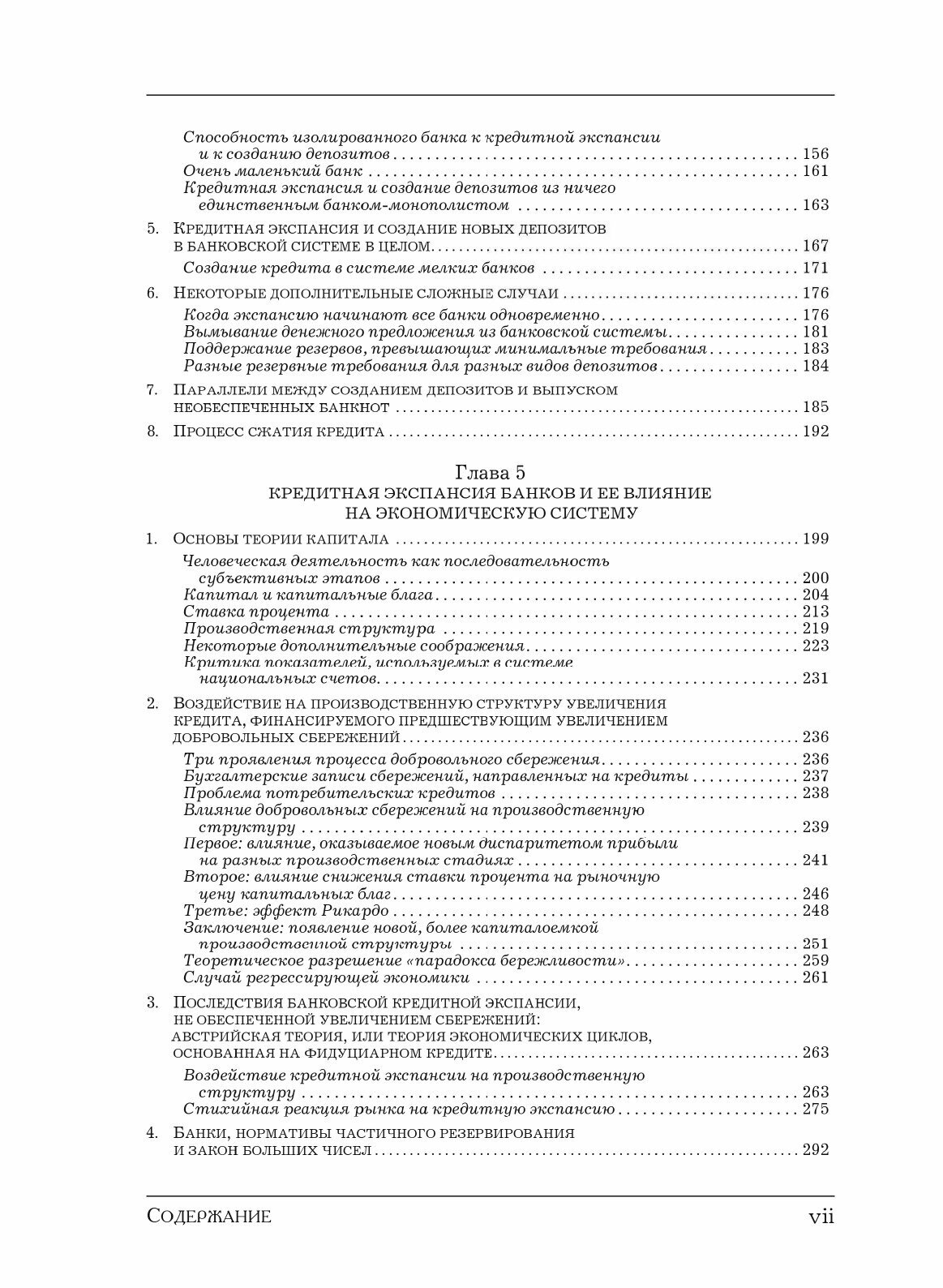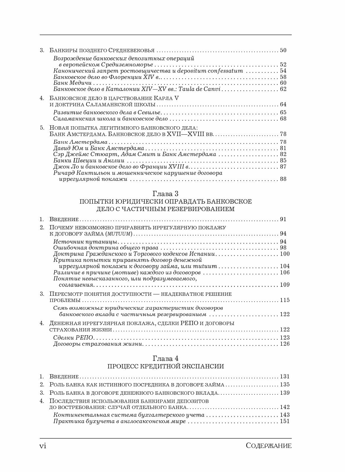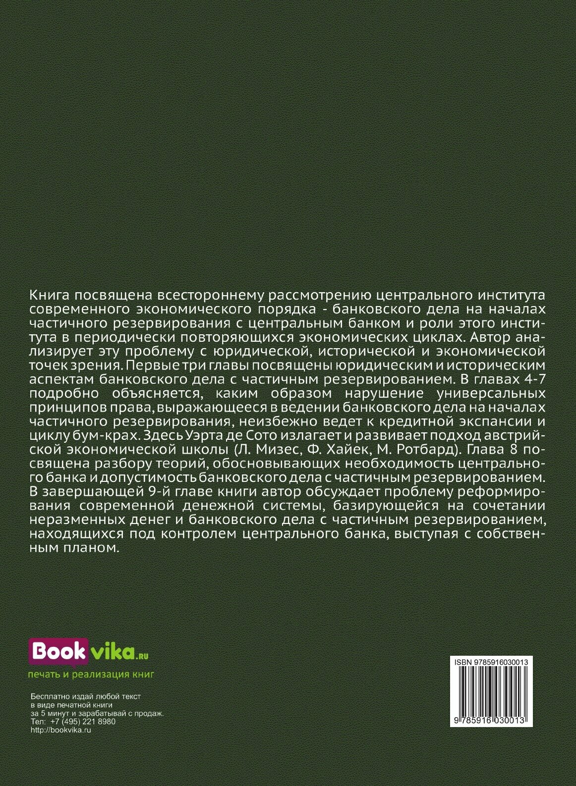 Книга посвящена всестороннему рассмотрению центрального института современного экономического порядка — банковского дела на началах частичного резервирования с центральным банком и роли этого института в периодически повторяющихся экономических циклах. Автор анализирует эту проблему с юридической, исторической и экономической точек зрения. Первые три главы посвящены юридическим и историческим аспектам банковского дела с частичным резервированием. В главах 4—7 подробно объясняется, каким образом нарушение универсальных принципов права, выражающееся в ведении банковского дела на началах частичного резервирования, неизбежно ведет к кредитной экспансии и циклу бум—крах. Здесь Уэрта де Сото излагает и развивает подход австрийской экономической школы (Л. Мизес, Ф. Хайек, М. Ротбард). Глава 8 посвящена разбору теорий, обосновывающих необходимость центрального банка и допустимость банковского дела с частичным резервированием. В завершающей 9-й главе книги автор обсуждает проблему реформирования современной денежной системы, базирующейся на сочетании неразменных денег и банковского дела с частичным резервированием, находящихся под контролем центрального банка, выступая с собственным планом.