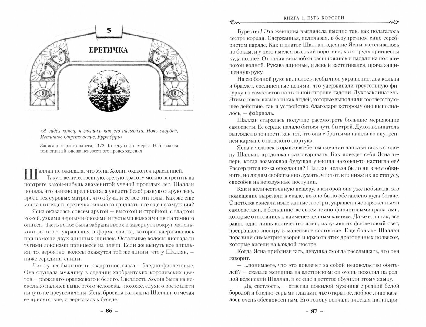 Рошар — мир во власти великих бурь, сметающих все живое на своем пути. Но есть и то, что страшнее любой великой бури, – это истинное опустошение. Одно лишь его ожидание меняет судьбы целых народов. Сумеют ли люди сплотиться перед лицом страшной угрозы? Найдется ли тот, для кого древняя клятва — жизнь прежде смерти, сила прежде слабости, путь прежде цели — станет чем-то большим, нежели просто слова?