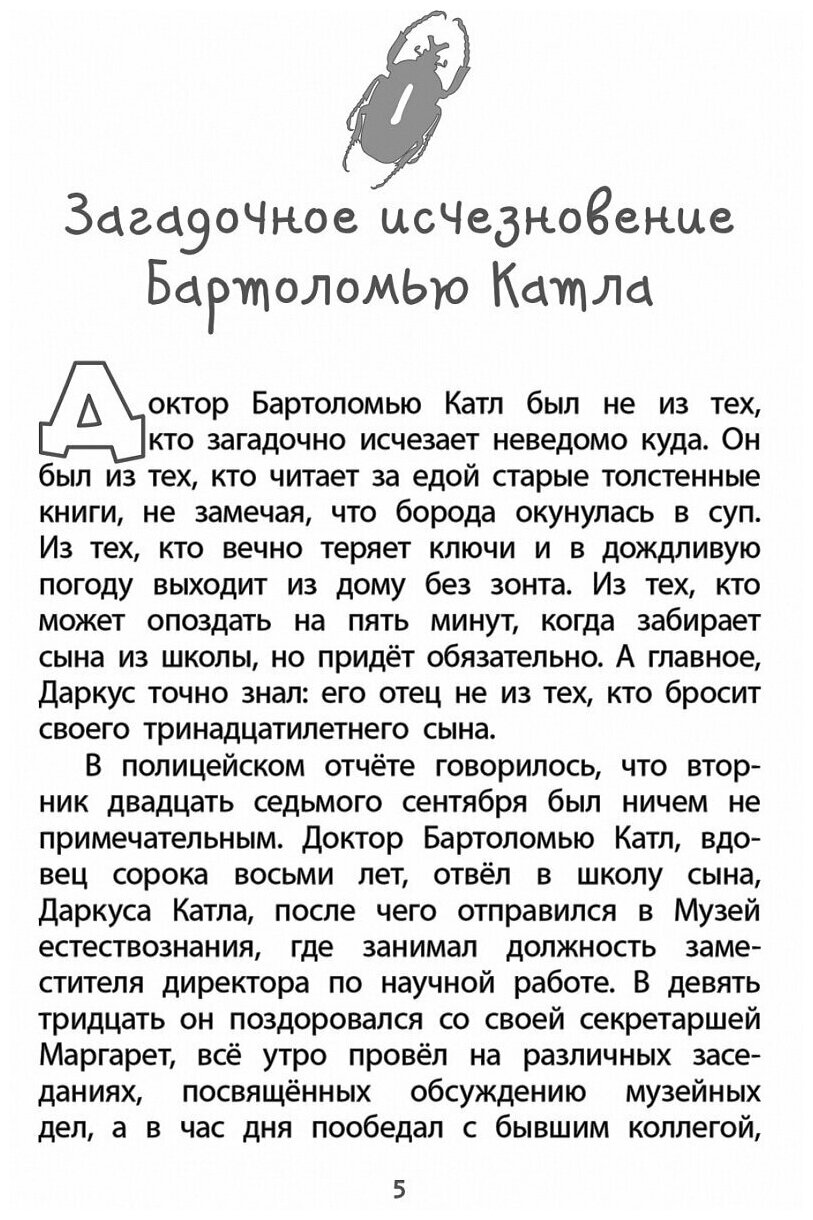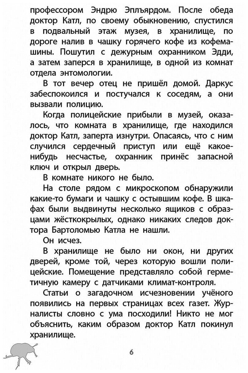 Майя Г. Леонард написала совершенно чудесную историю с элементами детектива и фэнтези. Касаемо первого - главный герой Маркус вместе со своим дядей и друзьями пытается выяснить куда пропал его отец из закрытой музейной комнаты. А касаемо второго - вас будут ждать очень необычные жуки, они не говорят, но прекрасно понимают человеческую речь, и сыграют в этой книги далеко не последнюю роль!Книжка читается легко и обязательно придется по вкусу подросткам. Майя хорошо постаралась в создании образов персонажей. Чего стоит, к примеру, главная злодейка- этакая смесь Круэллы Де Виль из «101 далматинца» и Миранды Пристли из "Дьявол носит Prada". -
