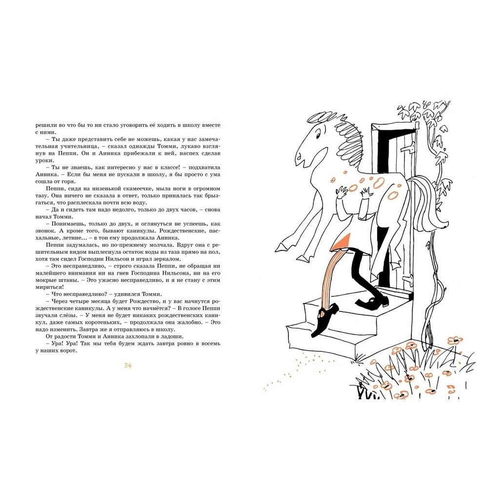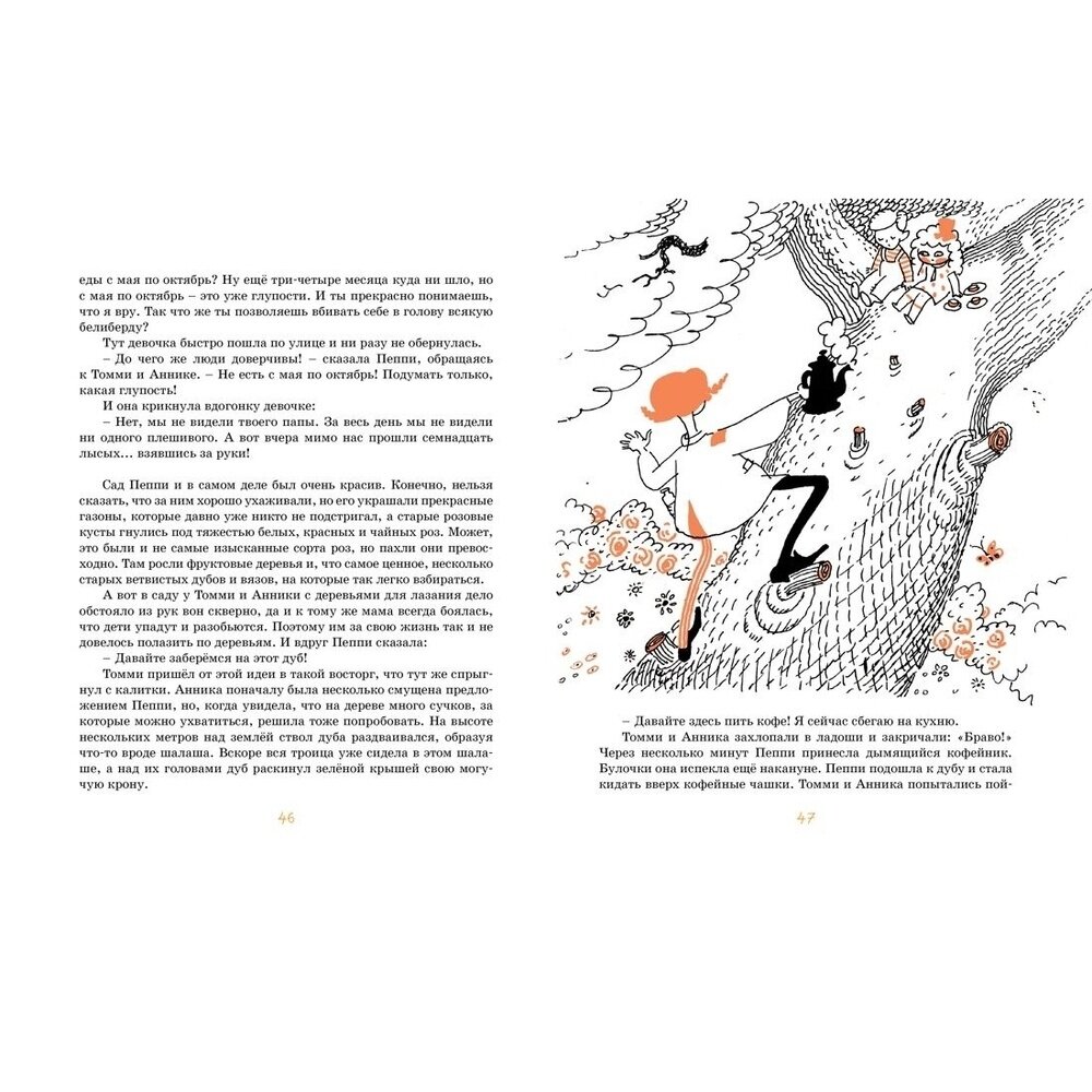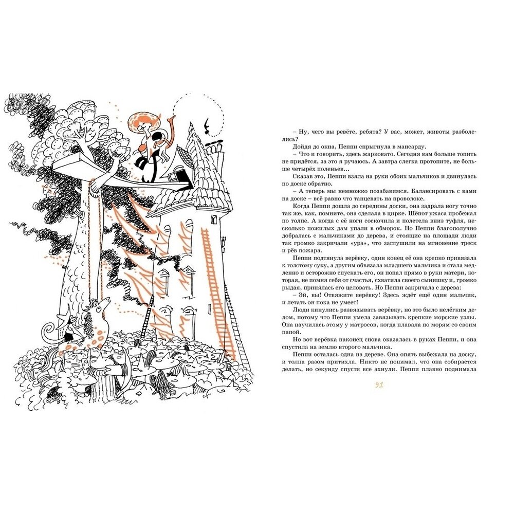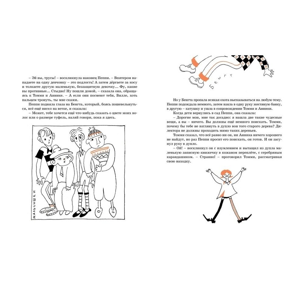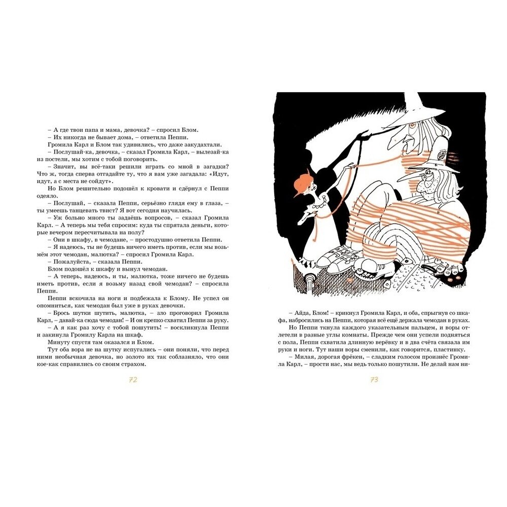 Когда я увидела на полке в магазине книгу прямо из детства, сразу купила. Очень нравится тенденция репринтов советских или постсоветских изданий, это как раз рассчитано на ностальгирующих взрослых, которые хотят «ту самую книжку из детства». Издание прекрасное, книга очень яркая, хотя используется всего три цвета: белый, чёрный и рыжий. Иллюстрации скорее минималистичные, без большого количества деталей, но в этом их прелесть, выполнены с большим чувством юмора. Сама история про самую сильную девочку никогда не была моей любимой, но тем не менее без неё невозможно представить ни одну сказочную домашнюю библиотеку.