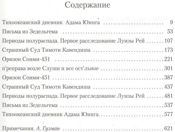Книга для тех, кто любит, заморачивать себе мозги, конечно не во всех шести завернутых отдельных сюжетах это явствует. Красная линия видна, но сразу не уловишь. Отличие от фильма, как и всегда представляешь что-то своё. Рекомендую, не пожалеете увидеть мир, который автор так упорно складывает по крупицам.