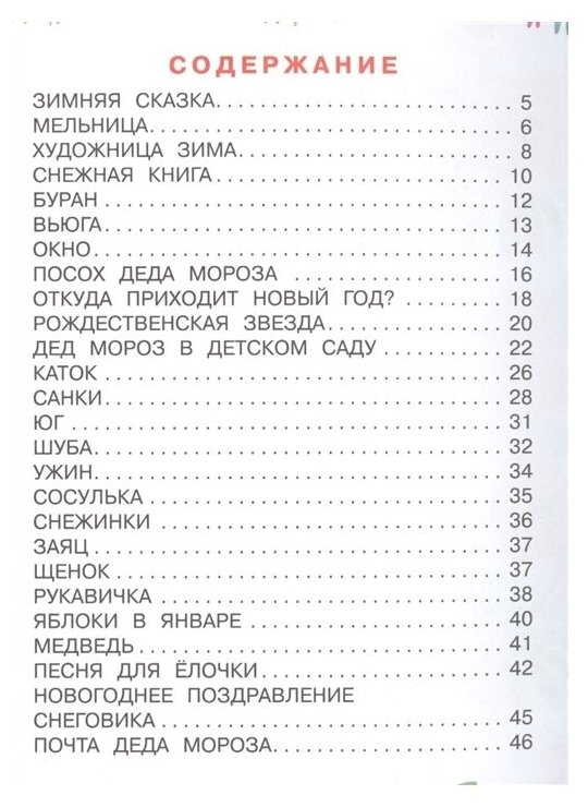 книга достаточно красочная, рисунки на весь разворот, текст достаточно крупный для самостоятельного чтения детьми, листы плотные, запах краски присутствует, стихи хорошие, первая половина книги стихи на зимнюю тему, в т.ч. новогодние, вторая половина про праздники и прочии, книга мне понравилась!