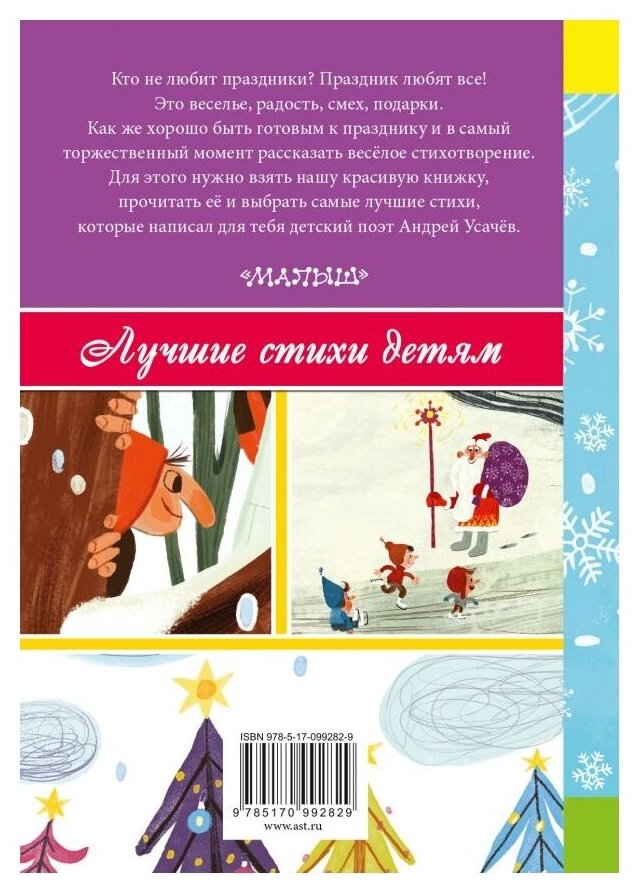 Мне и детям книжка понравилась. Мы любим стихи А.Усачева, а в этой книге все стихи для нас новые, кроме Зимней сказки и Откуда приходит Новый год. Качество хорошее, рисунки симпатичные. Удобный формат. И цена приемлемая. Дети 2 и 4 лет слушают с удовольствием.