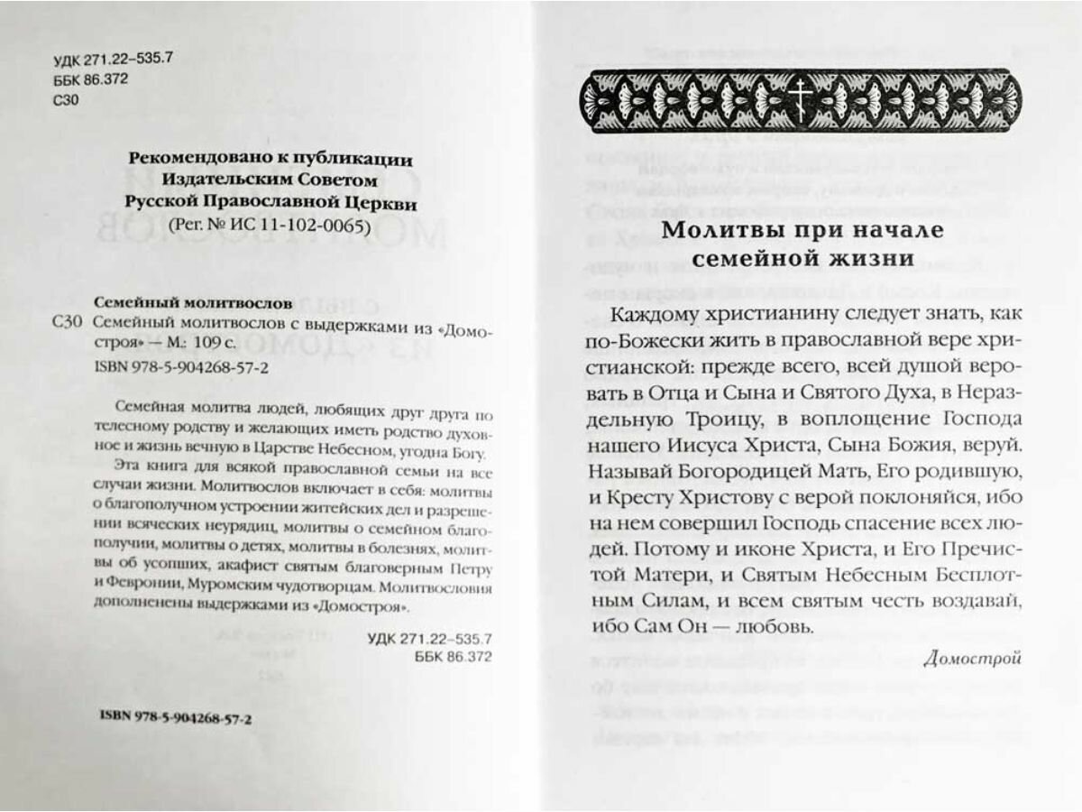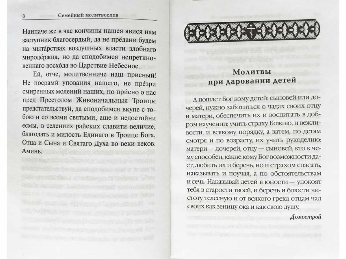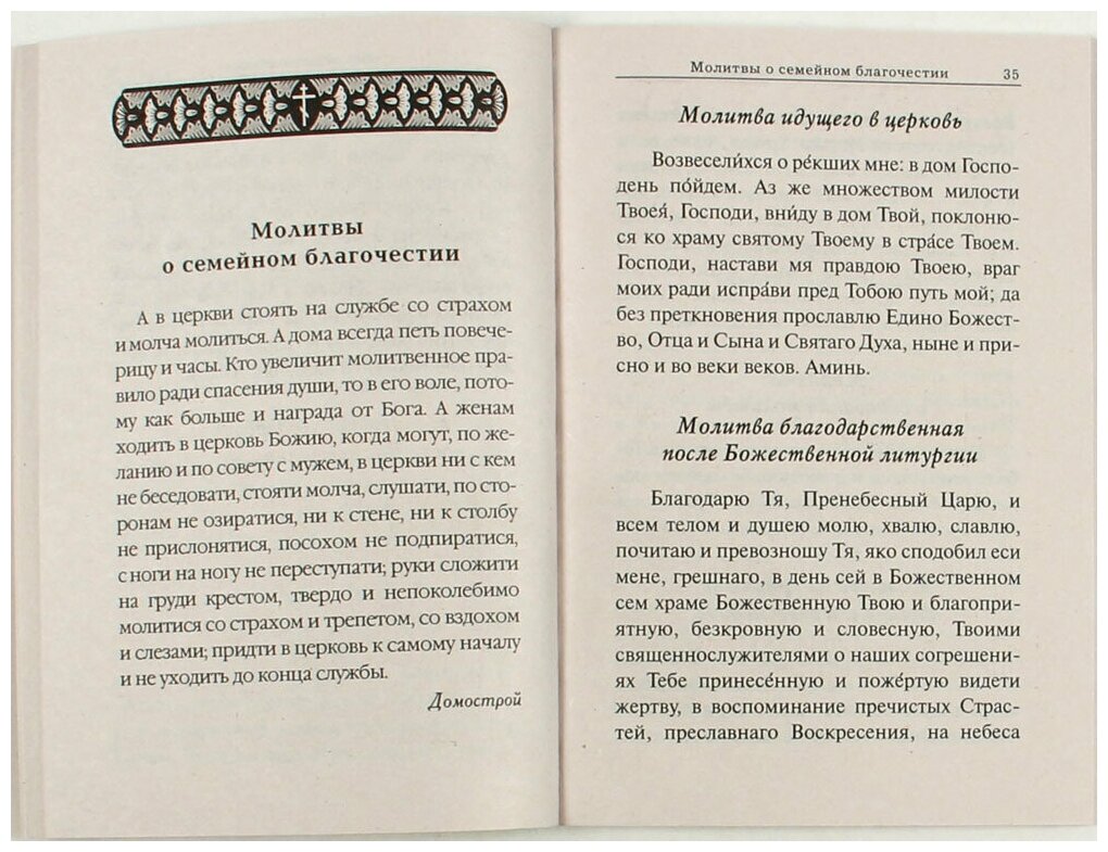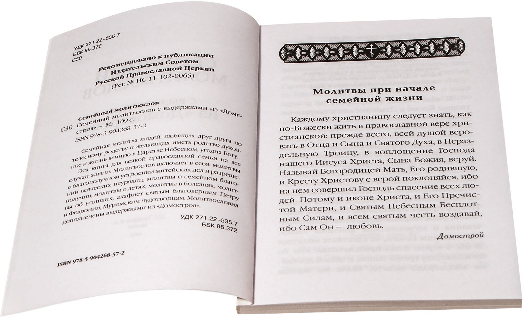 .Эта книга для всякой православной семьи на все случаи жизни. Молитвослов включает в себя: молитвы о благополучном устроении житейских дел и разрешении всяческих неурядиц, молитвы о семейном благополучии, молитвы о детях, молитвы в болезнях, молитвы об усопших, акафист святым благоверным Петру и Февронии, Муромским чудотворцам. Молитвословия дополненены выдержками из «Домостроя»,