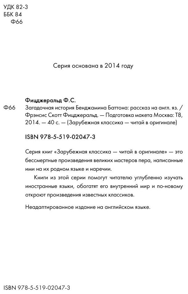 прекрасный вариант для тех,кто только начинает постигать английский язык вдумчиво. Если вы знаете английский хорошо,то эта книга погрузит вас в удивительно красивый мир. Как и все произведения Скотта Фицджеральда, Невероятная история Бенджамина Баттона заставляет задумать и оставляет приятный осадок в душе на долгое время! Советую к прочтению!