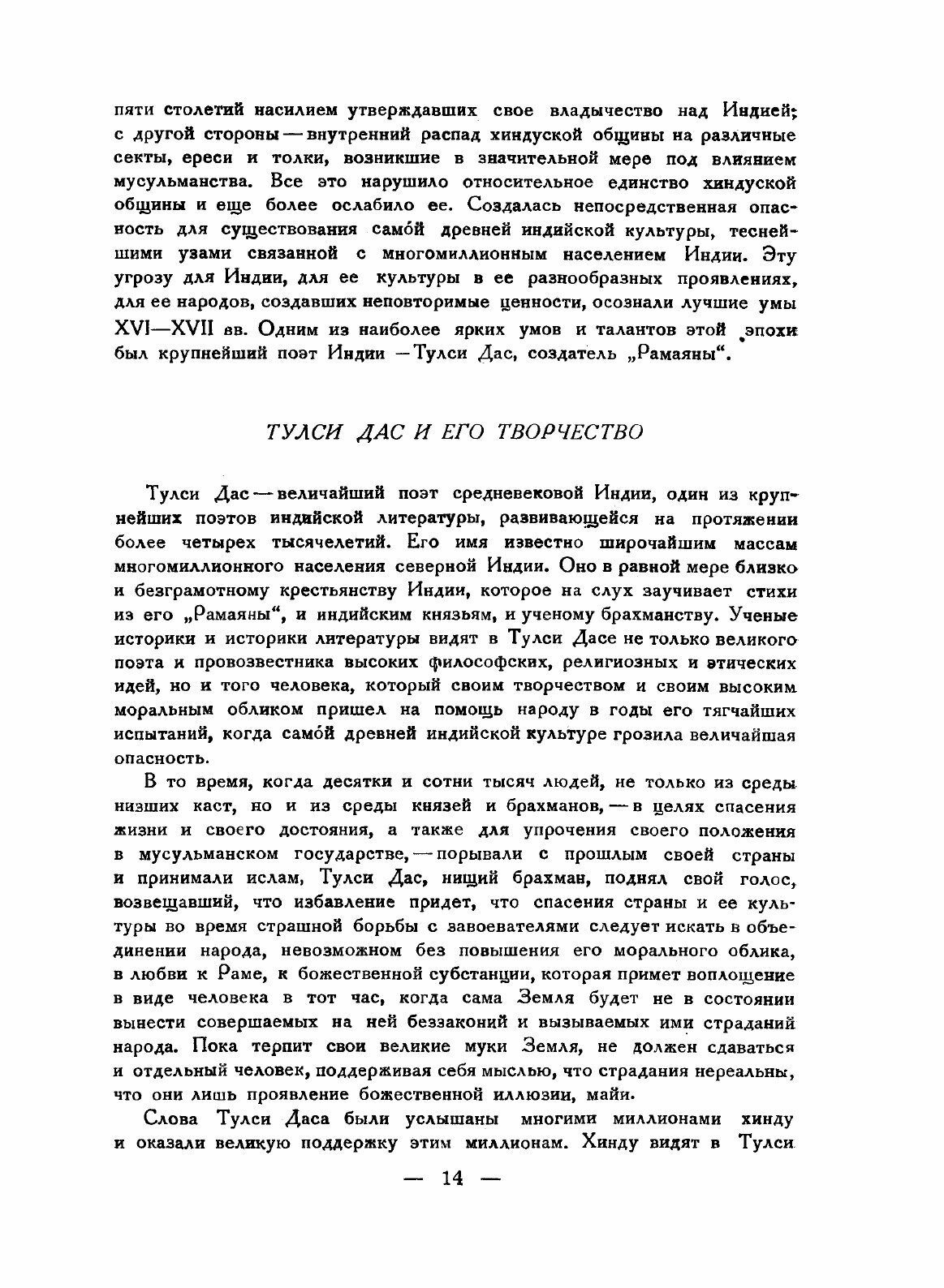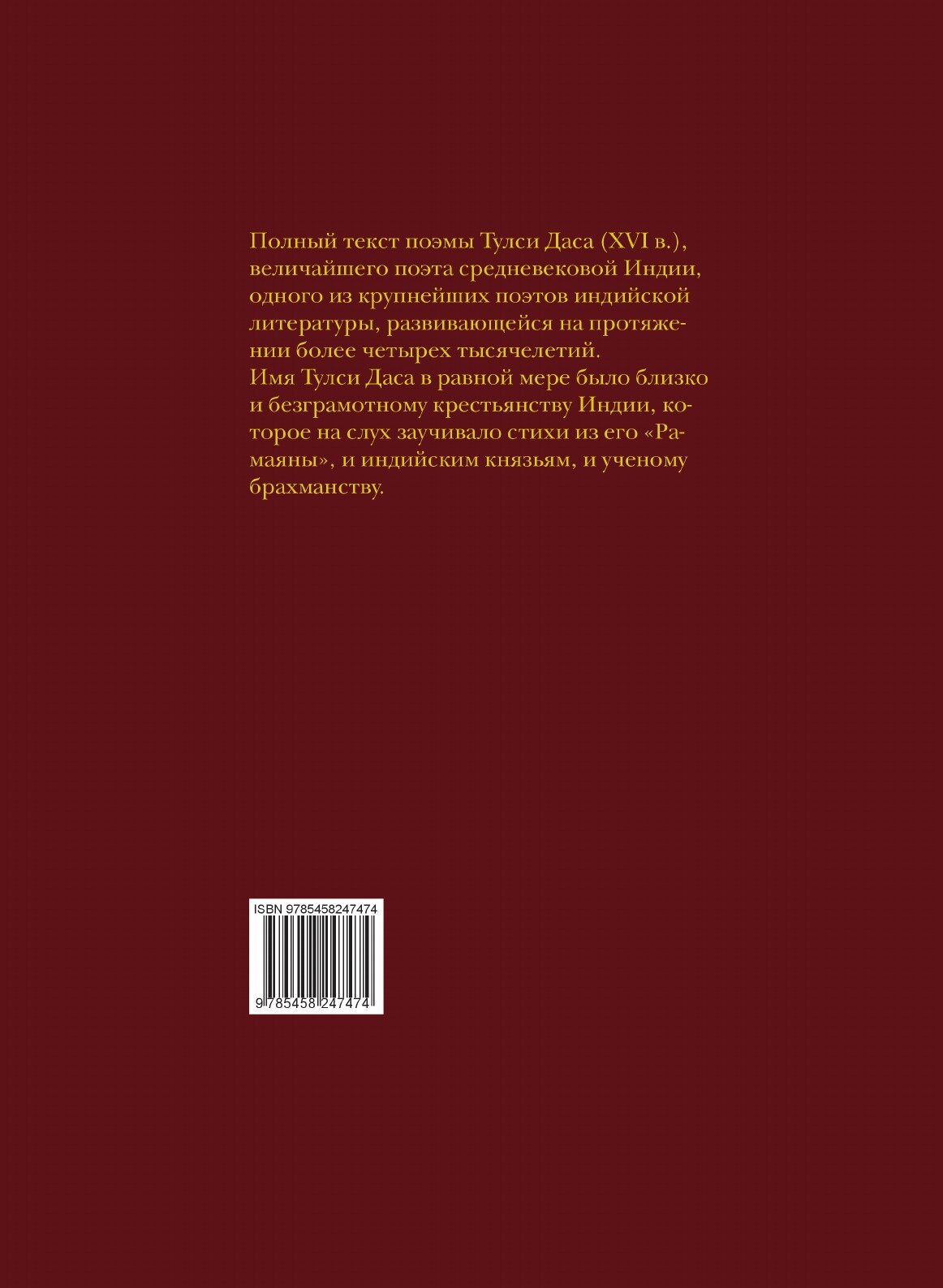 Полный текст поэмы Тулси Даса (XVI в.), величайшего поэта средневековой Индии, одного из крупнейших поэтов индийской литературы, развивающейся на протяжении более четырех тысячелетий. Имя Тулси Даса в равной мере было близко и безграмотному крестьянству Индии, которое на слух заучивало стихи из его «Рамаяны», и индийским князьям, и ученому брахманству.