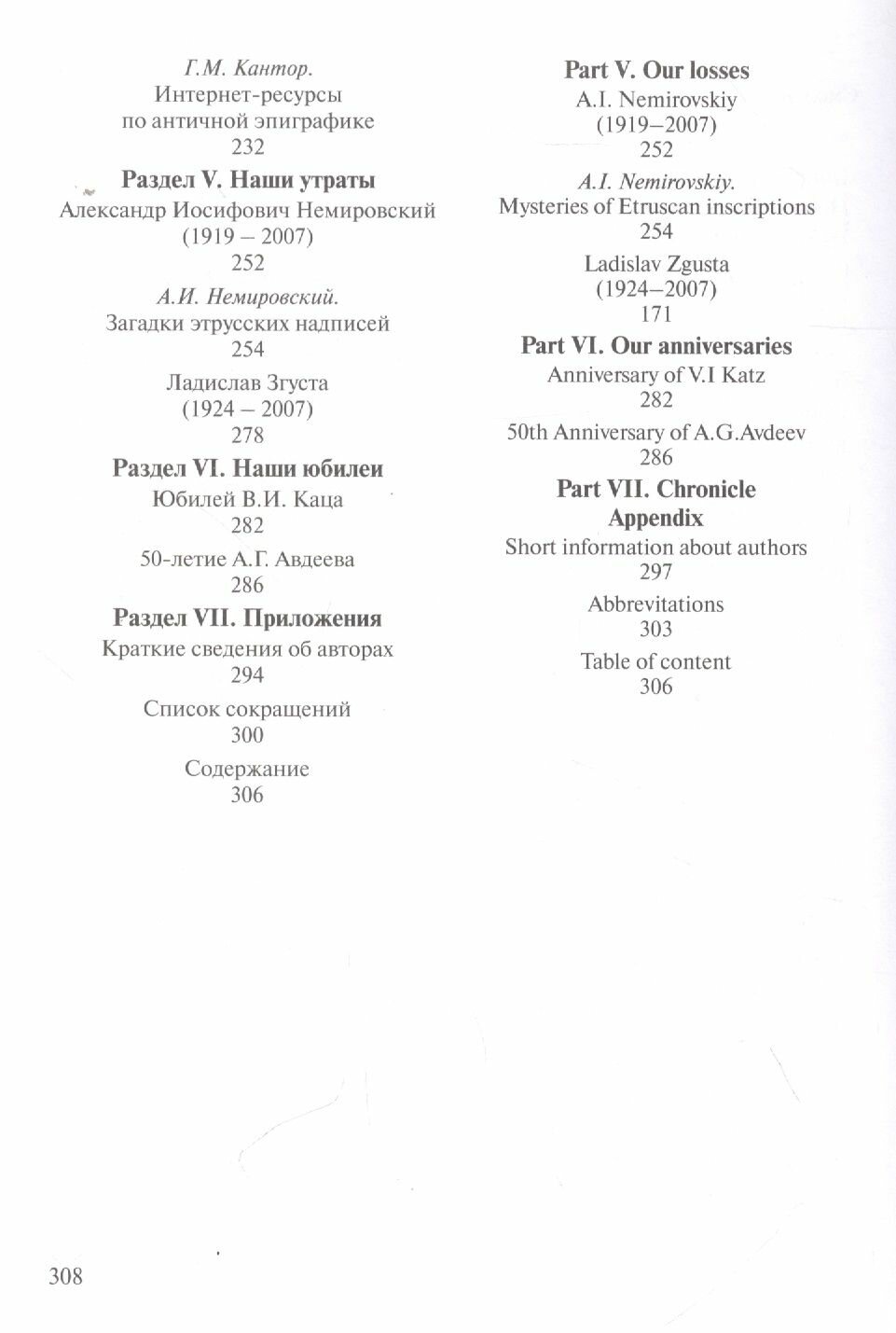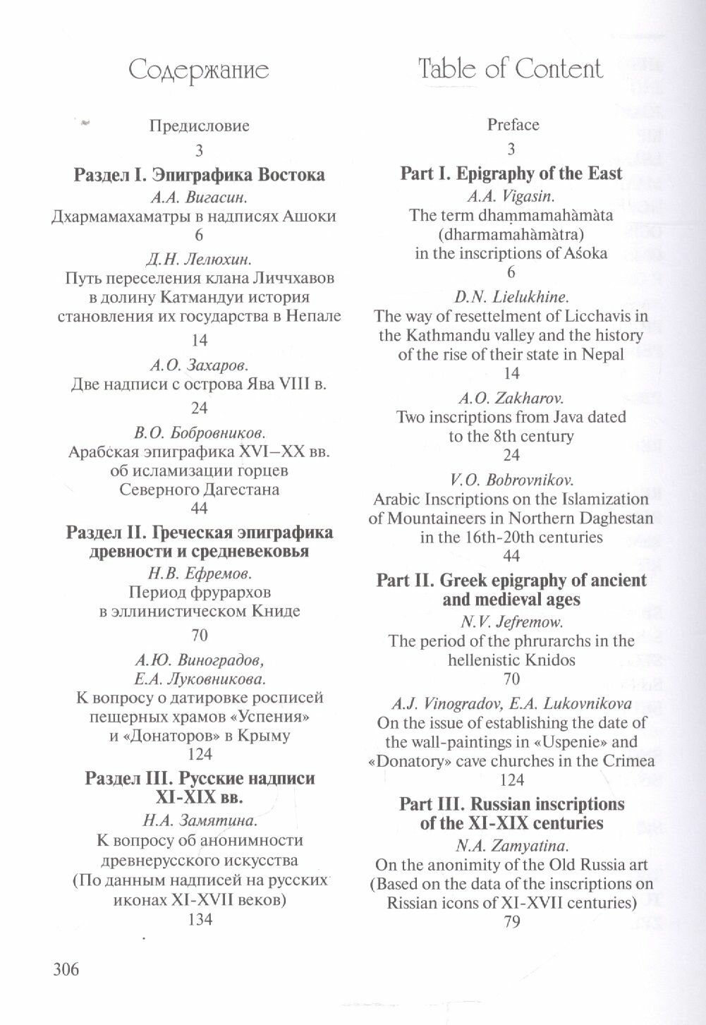 Сборник состоит из четырех разделов. Первый раздел посвящен эпиграфическим памятникам Востока. Во вторую часть включены статьи, посвященные греческим надписям античного и византийского времени. Третья часть объединяет статьи, посвященные публикации и исследованию русских надписей XI-XIX вв. В четвертой части - "Научный архив" - дается краткий обзор монографий и сборников статей по эпиграфике, изданных в России в 2006 г. и Интернет-ресурсов по античной эпиграфике.