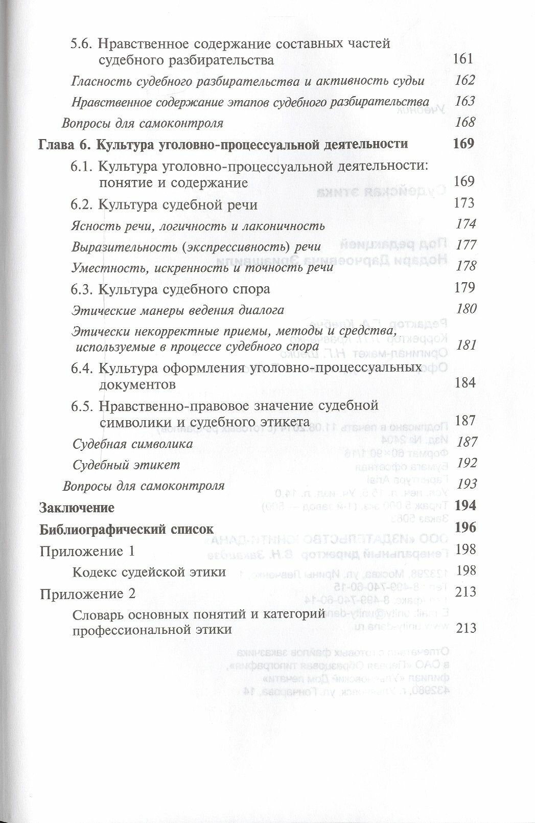 В соответствии со структурой курса и основными категориями этики в учебнике раскрываются содержание и социальная ценность профессиональной этики судьи. Выделяются ее специфика, нравственные аспекты назначения российского уголовного процесса и его принципов, институтов уголовно-процессуального доказывания и мер уголовно-процессуального принуждения, нравственные основы судебных стадий уголовного процесса, а также вопросы культуры уголовно-процессуальной деятельности. Значительное внимание уделено истории развития нравственно-правовых идей в процессе становления и развития отечественного судопроизводства, нравственно-психологическим требованиям, предъявляемым к работникам судебной системы.
